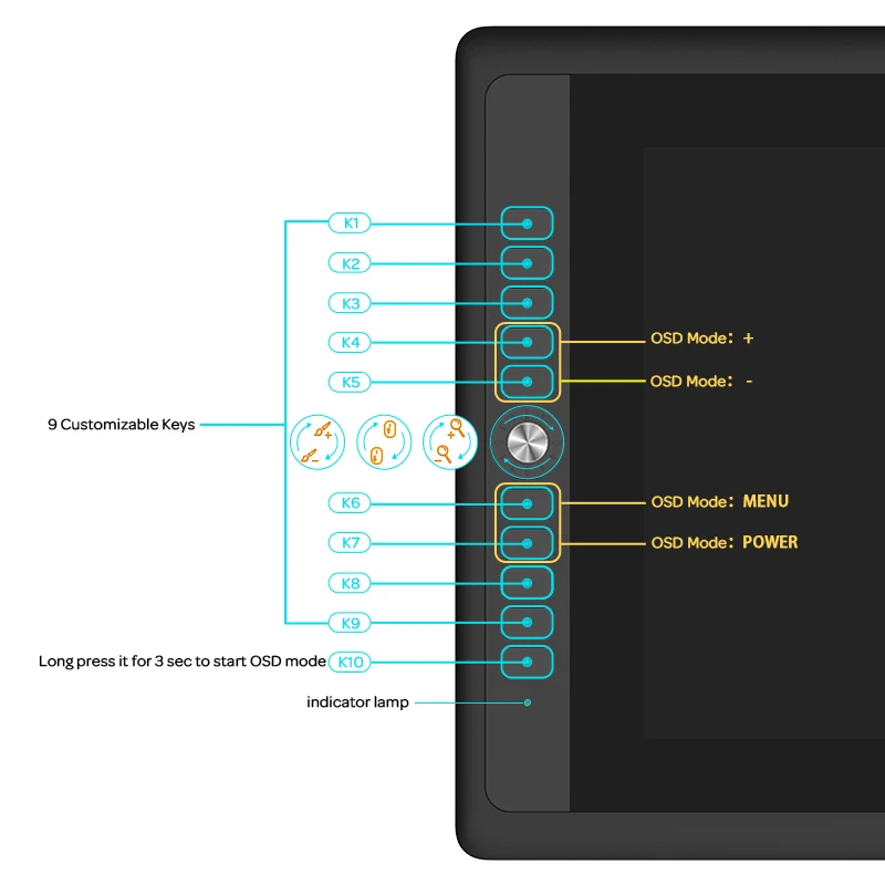 It ONLY works after installing GAOMON driver on windows OS. The default setting is to switch functions among zooming canvas, adjusting brush size, and scrolling page by pressing the round key,then rolling the ring to adjust size or move. Note: You can change the 3 default function in GAOMON driver. [LESS CABLE TO PLUG]–Only one Typc-C USB to plug into PD156 Pro. ; And Only USB Type-A & HDMI to plug into computer. Note: When computer cannot provide enough power, you need plug extra power adapter
