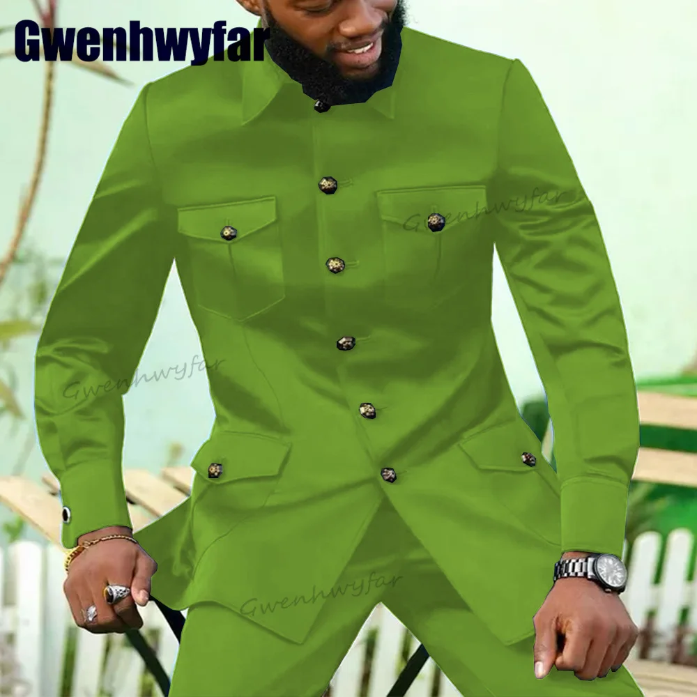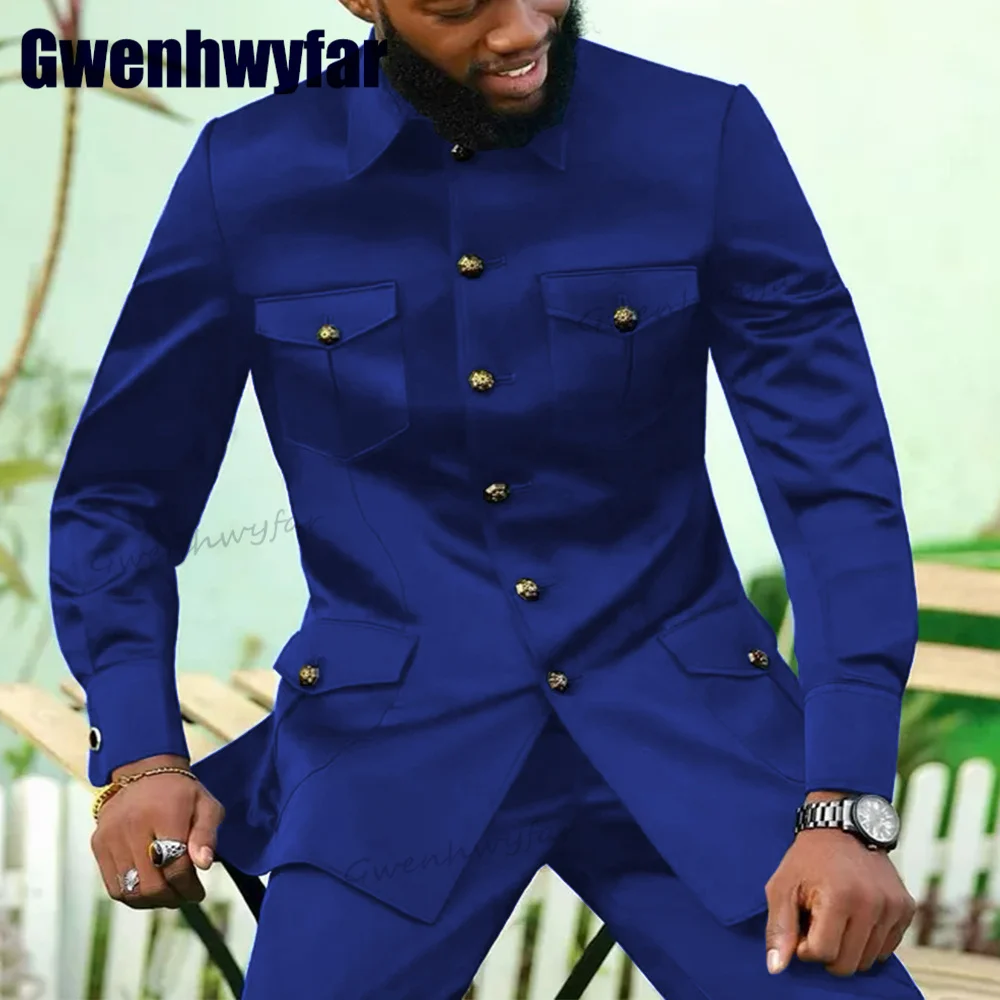 Gwenhwyfar High Quality Africa Stand Collar Chinese Design Male Suits Wedding Blazer Sets 2 Pcs Jacket Pants Men's Set 4 Pockets