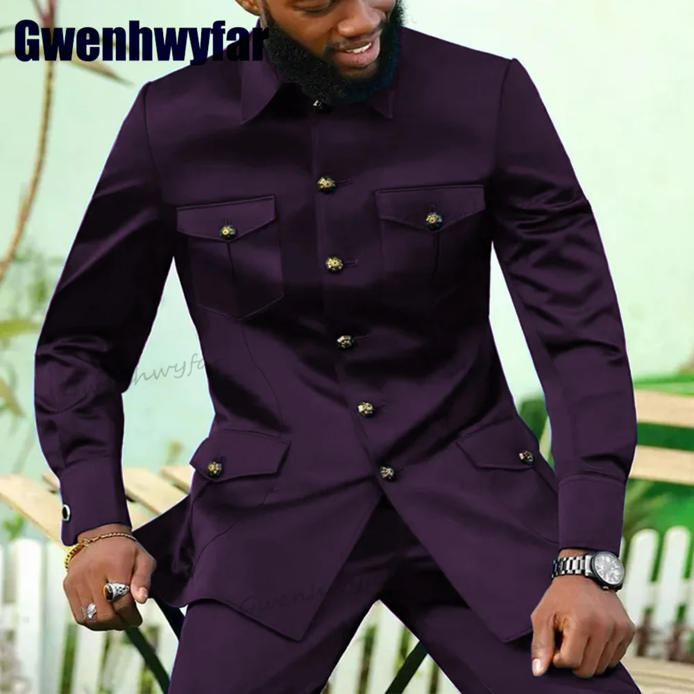 Gwenhwyfar High Quality Africa Stand Collar Chinese Design Male Suits Wedding Blazer Sets 2 Pcs Jacket Pants Men's Set 4 Pockets