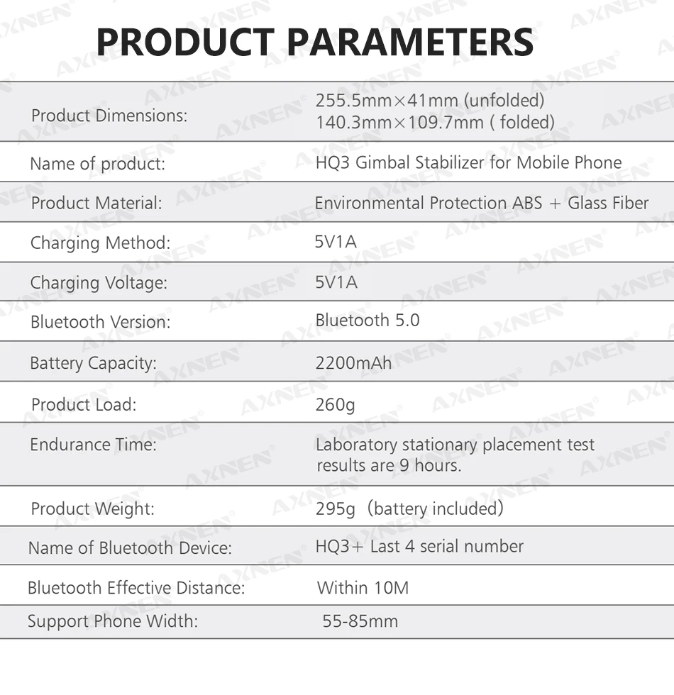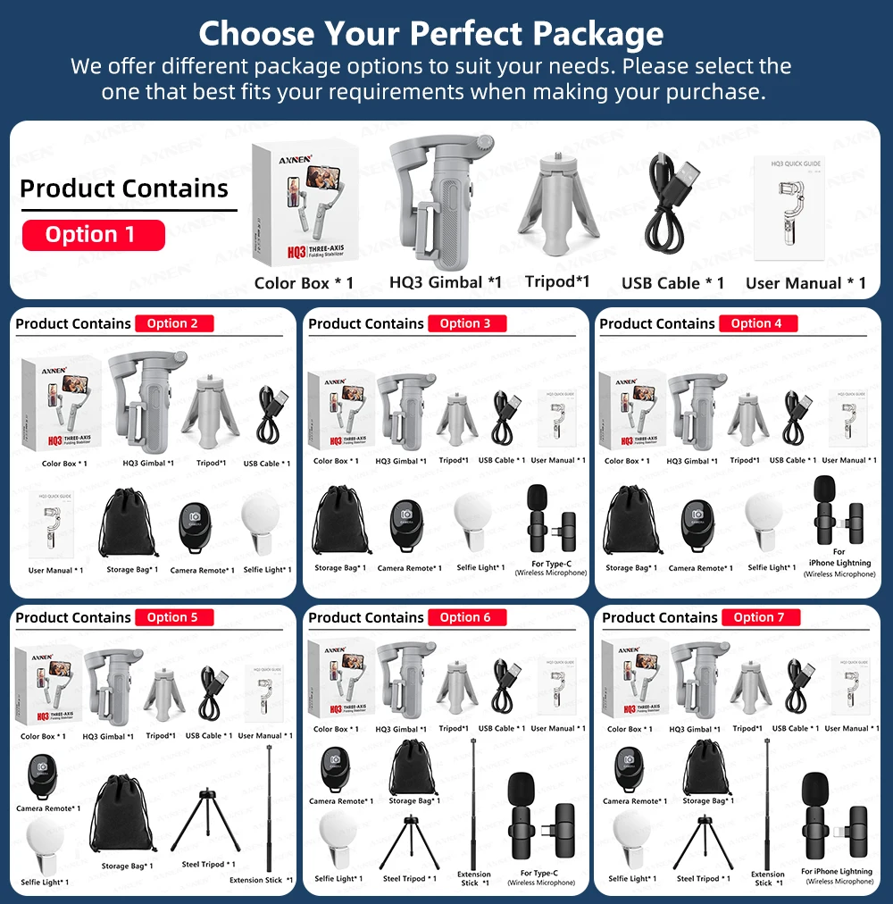 Option 1: Official Standard= AXNEN HQ3 Gimbal + Mini Tripod + USB Cable + User Manual + Color Box