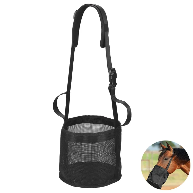 This mesh feed bag features a crown strap with slider buckle so that it will adjust to fit most horses and mules.