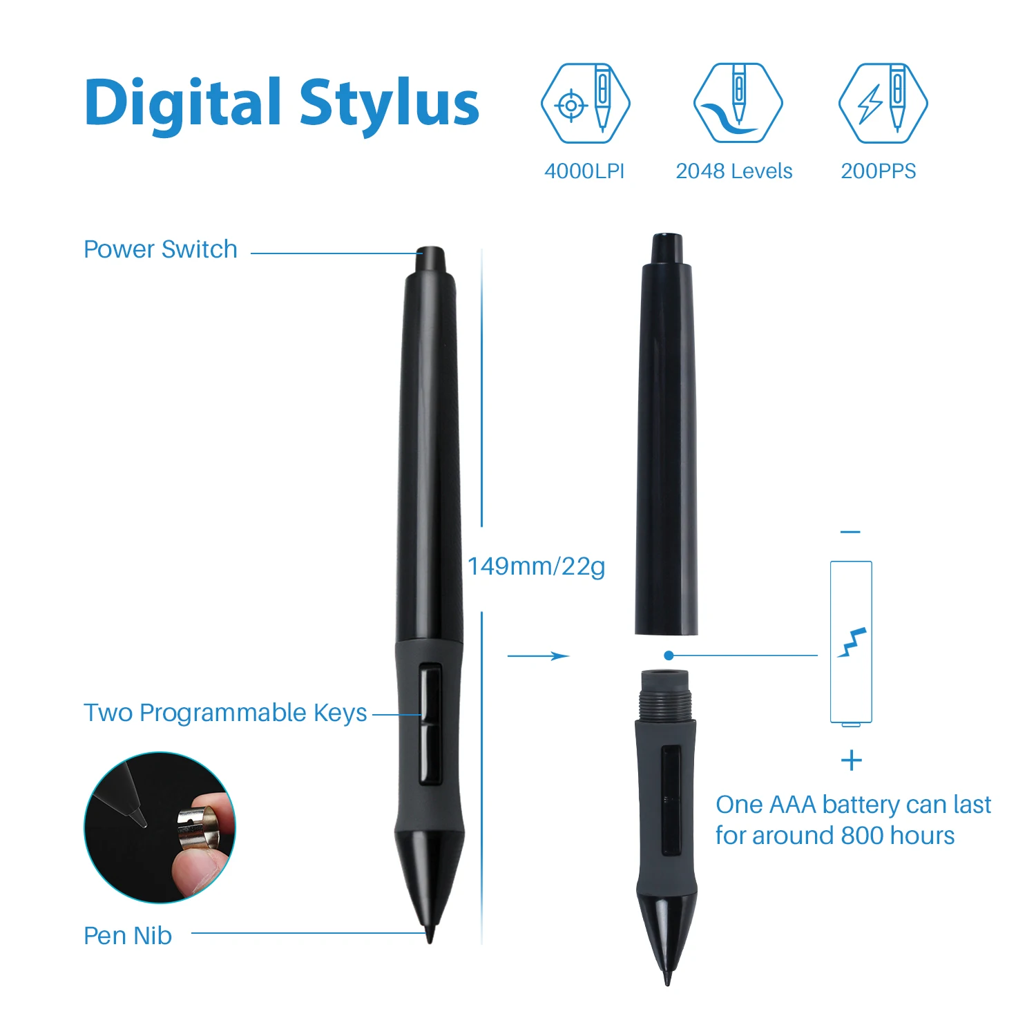 2. Resolution 4000 LPI; Report Rate 200RPS; Pen Pressure Level: 2048; Comes with a digital pen that has two customizable buttons, needs one AAA battery to operate, battery not included.