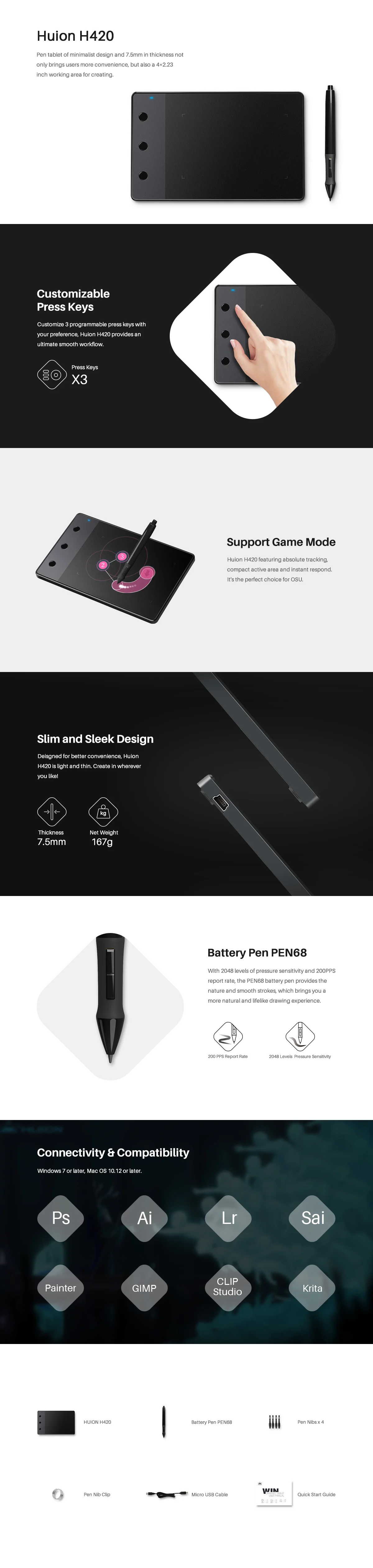 7. Warm tips: The huion 420/H420 can not work alone, you need to connect it to your computer or laptop with the usb cable. 420 and H420 is not compatible with phone. If you want to connect to an android phone, we recommend you choose the upgrade version H420X.