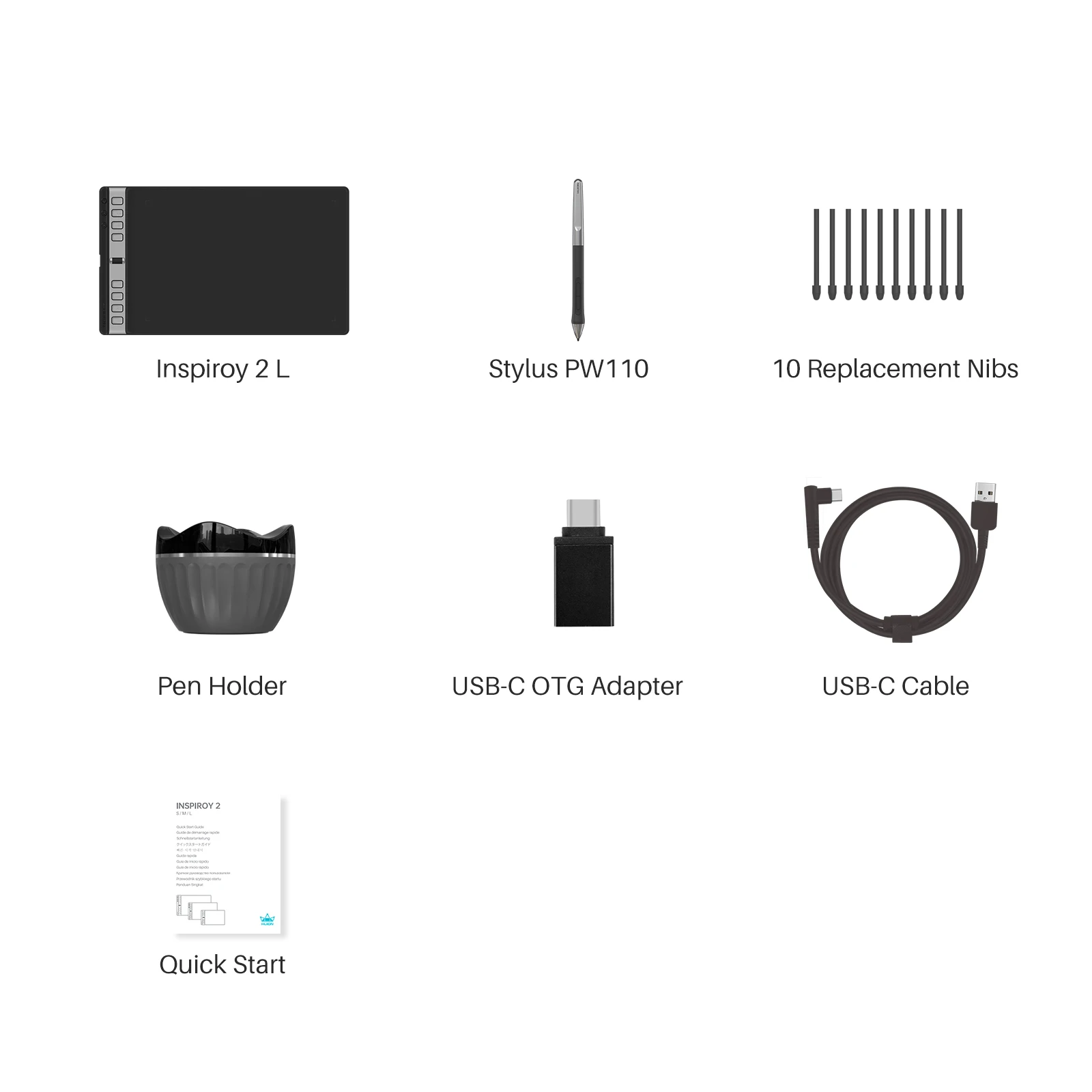 1x drawing tablet, 1x digital pen, 1x USB-C cable, 1x OTG adapter, 10x replacement nibs, 1x pen holder, 1x quick start guide, 1x Glove |