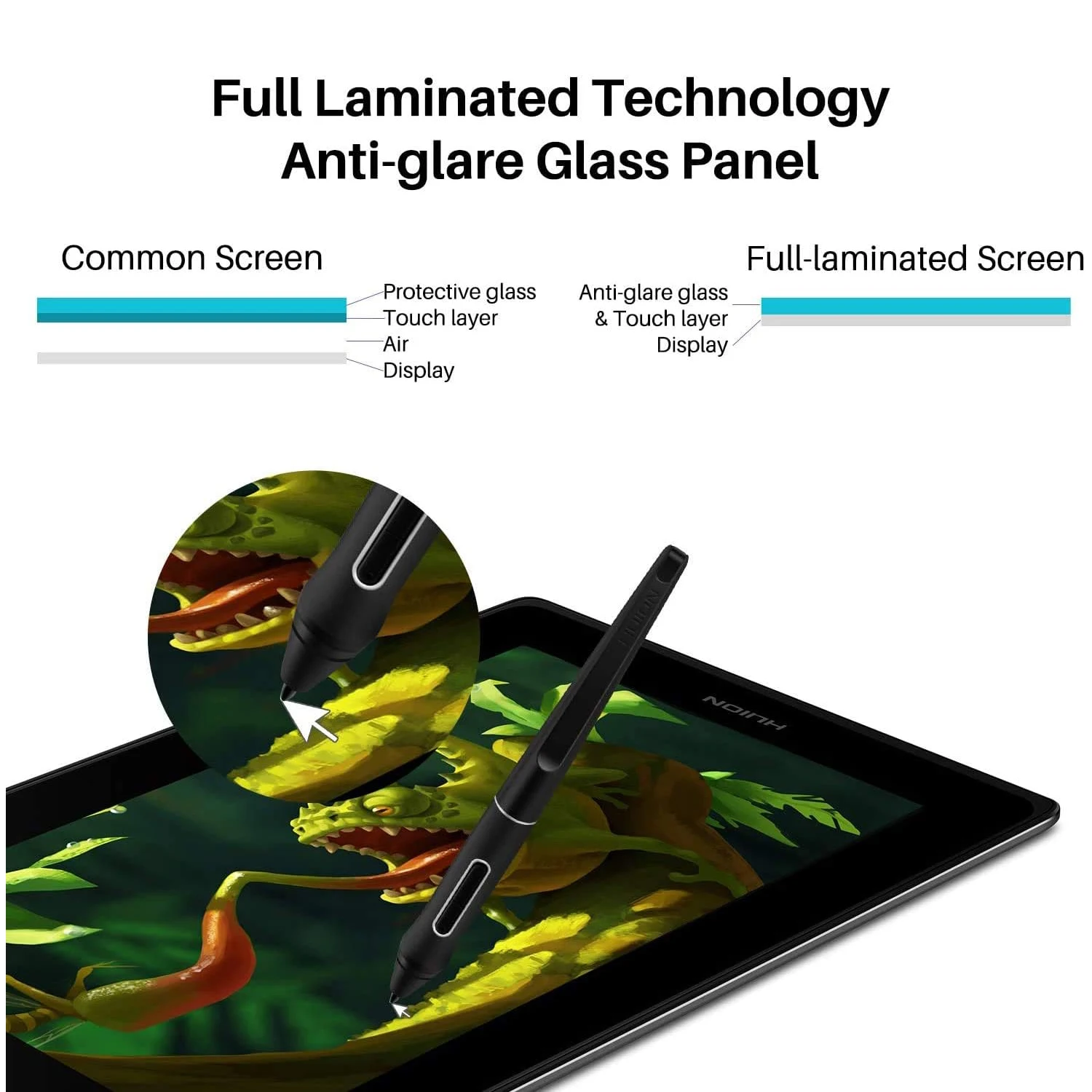 Kamvas Pro Series is equipped with a chemically etched anti-glare glass, which makes the screen can virtually eliminate reflections and reduce eye strain. The etched surface can also provide a matte finish and paper-like texture. Besides, It has full-laminated technology to improve visual quality, eliminate parallax and increase durability.