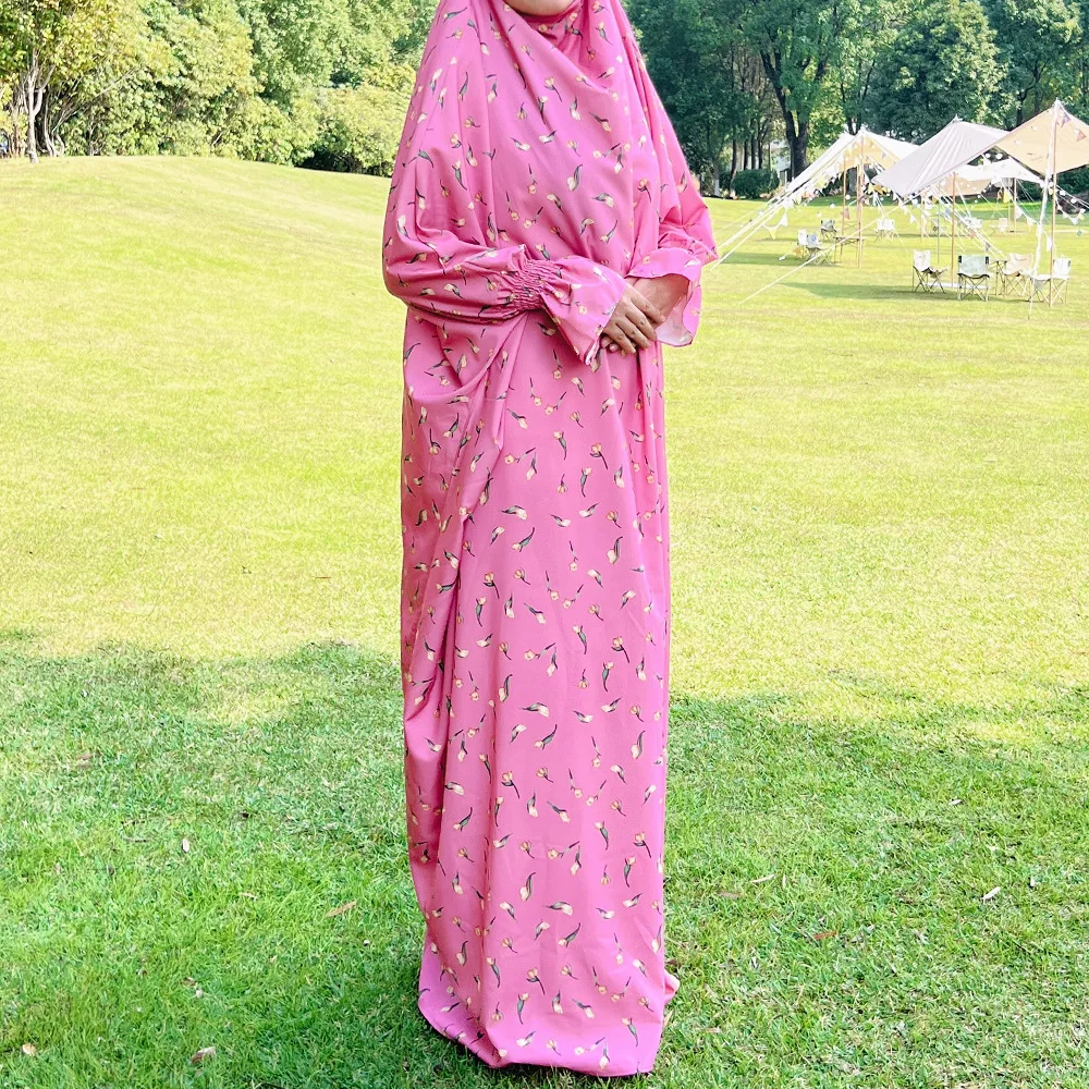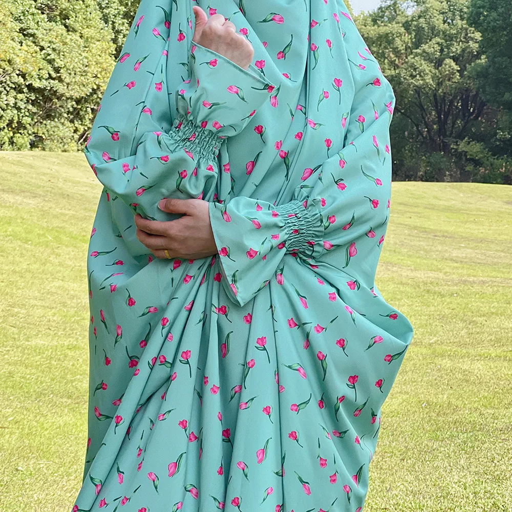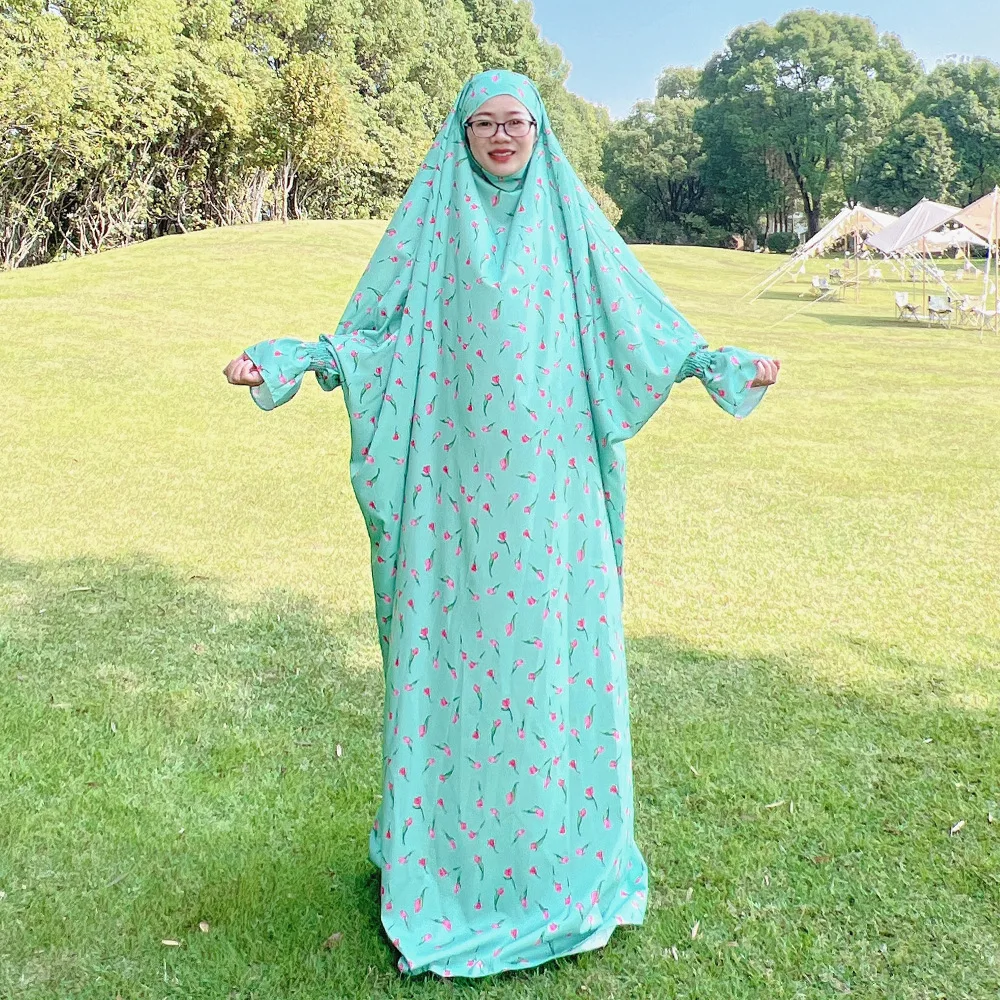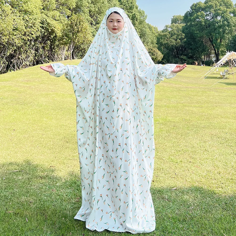 Jilbab One Piece Printed Prayer Dress Muslim Abaya with Integrated Veil Islamic Jilbabs for Women Ramadan Modest Outfit Dubai