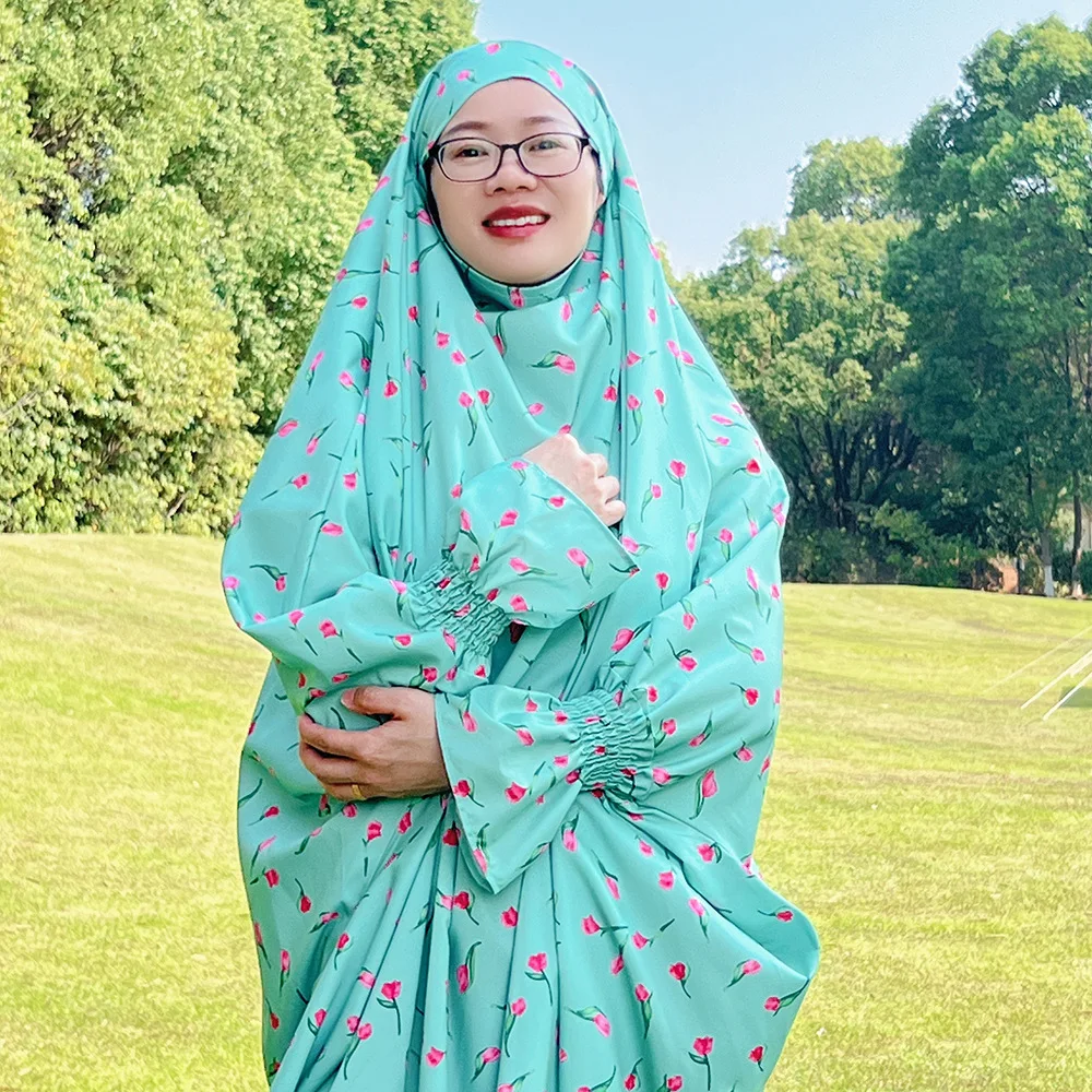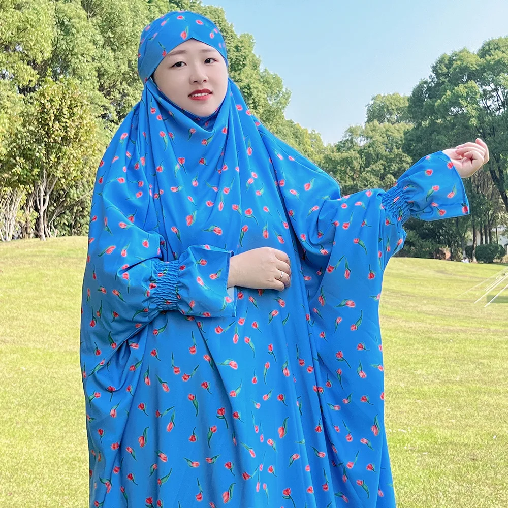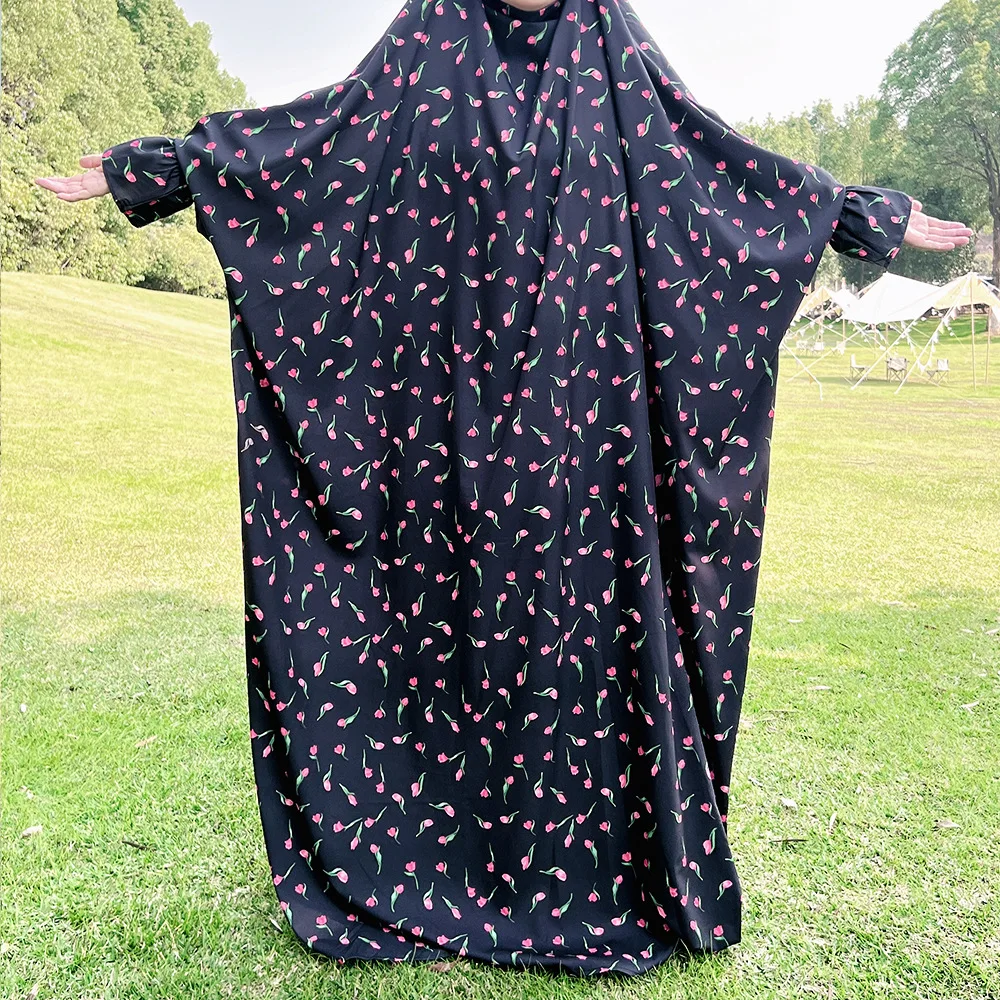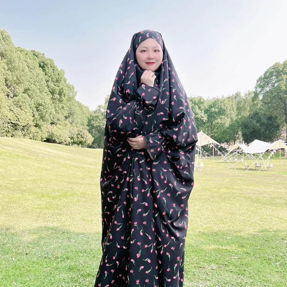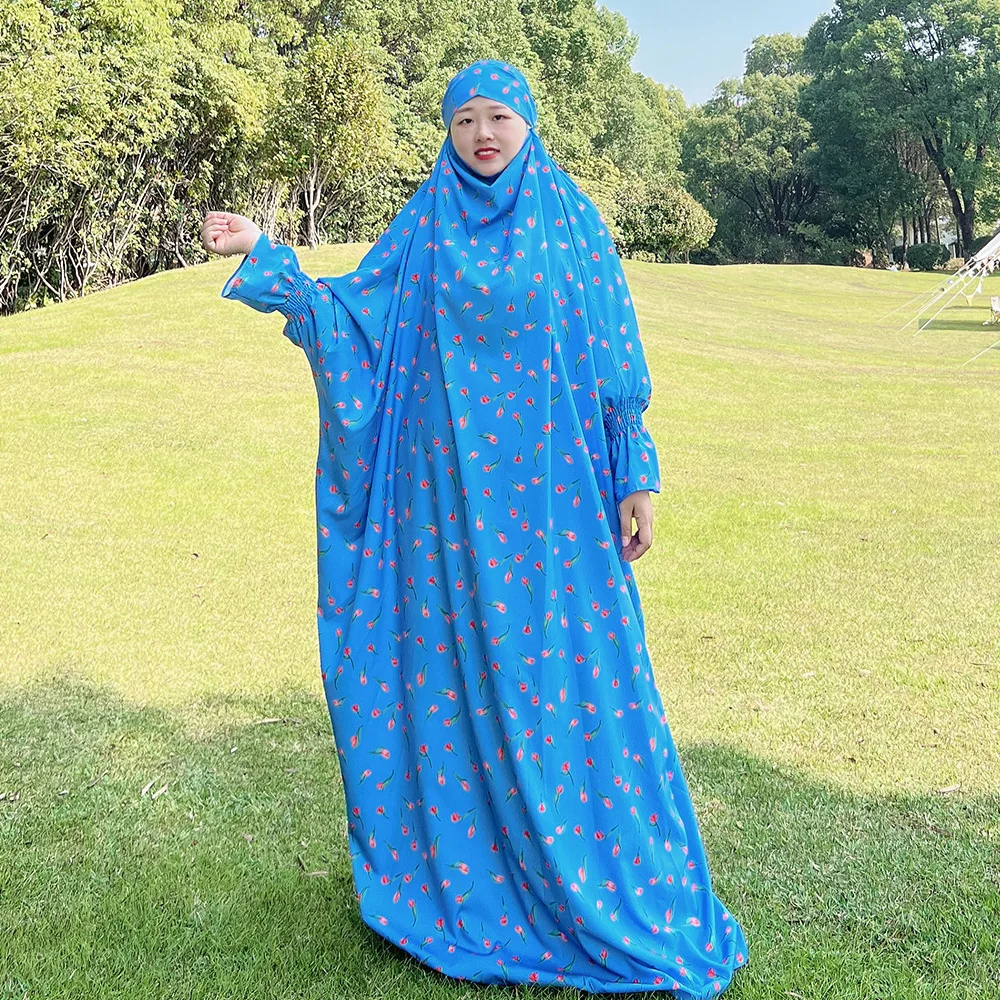 Jilbab One Piece Printed Prayer Dress Muslim Abaya with Integrated Veil Islamic Jilbabs for Women Ramadan Modest Outfit Dubai