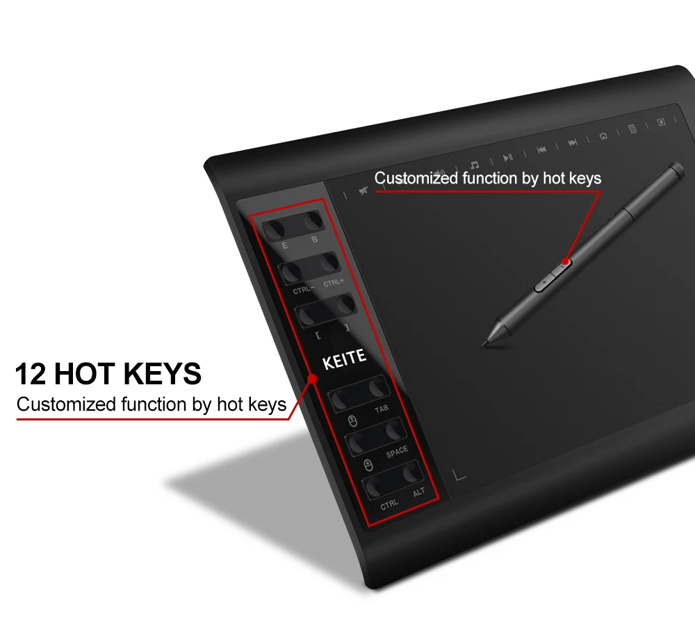 There are 12 define keys on the left and 10 media keys on the top of tablet, make the operation more efficient. 12 Express Keys on tablet— Can be customized based on your own preference. Largely increase your work efficiency.