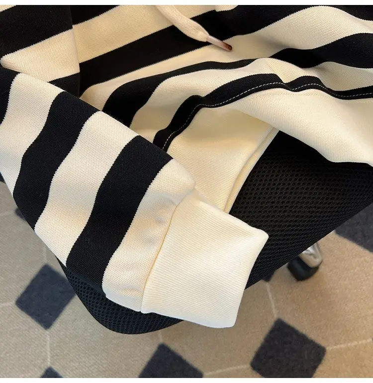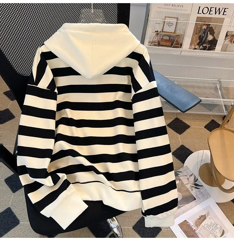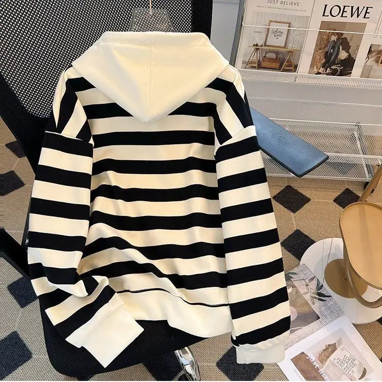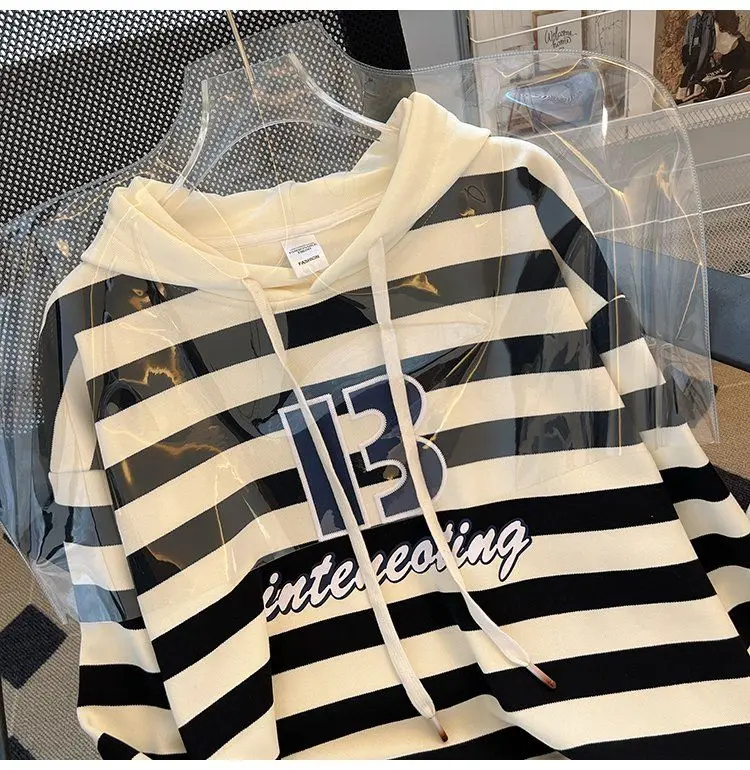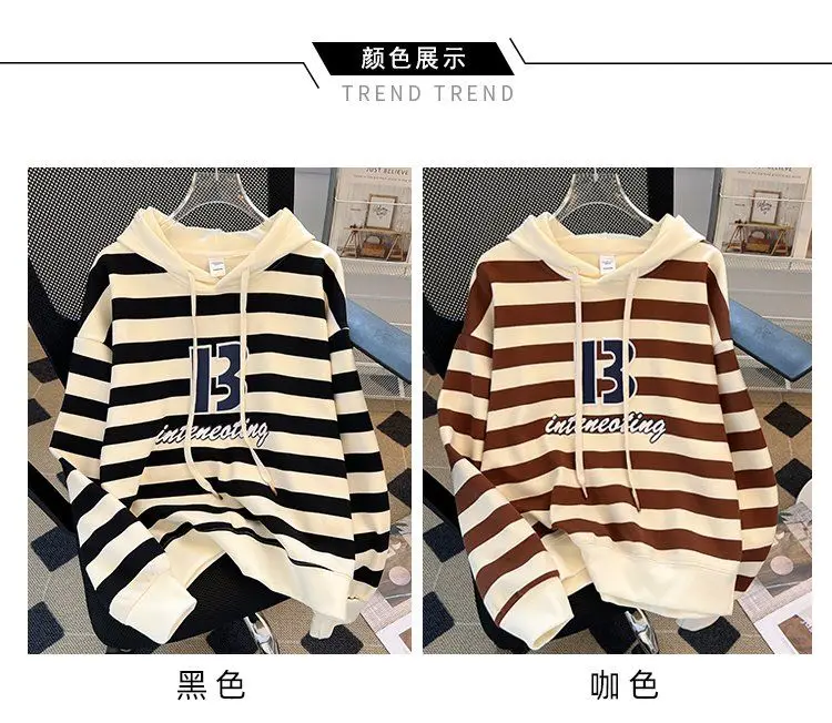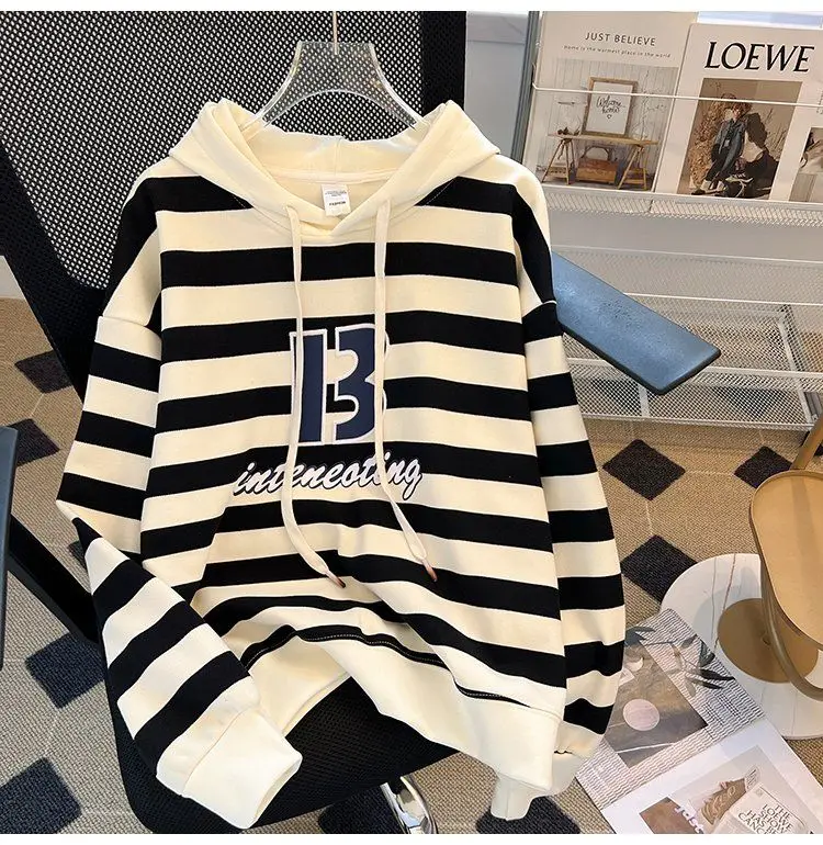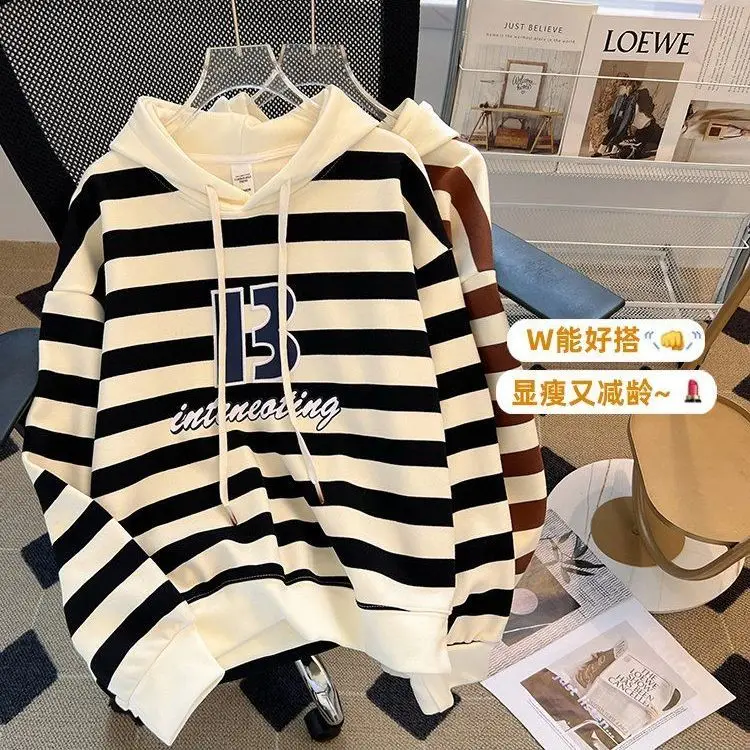 Large Size American Striped Hoodie for Women Thin and Chubby with a Loose Design and a Trendy Hooded Top