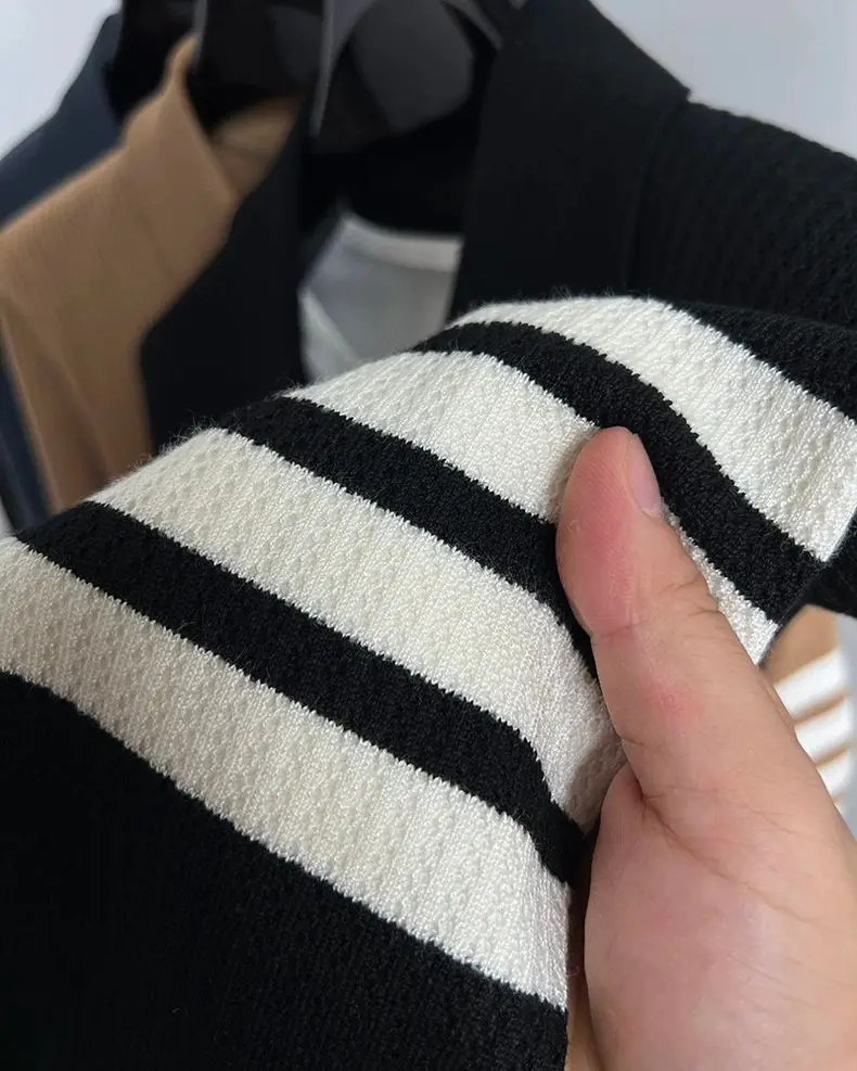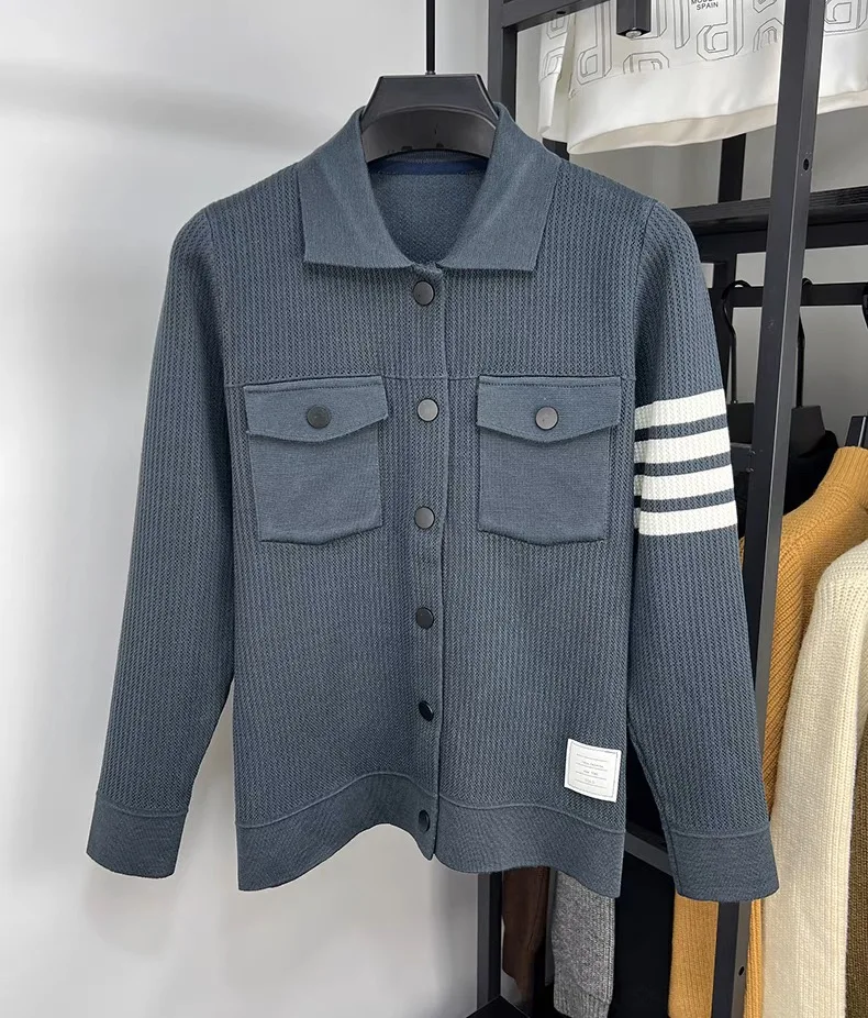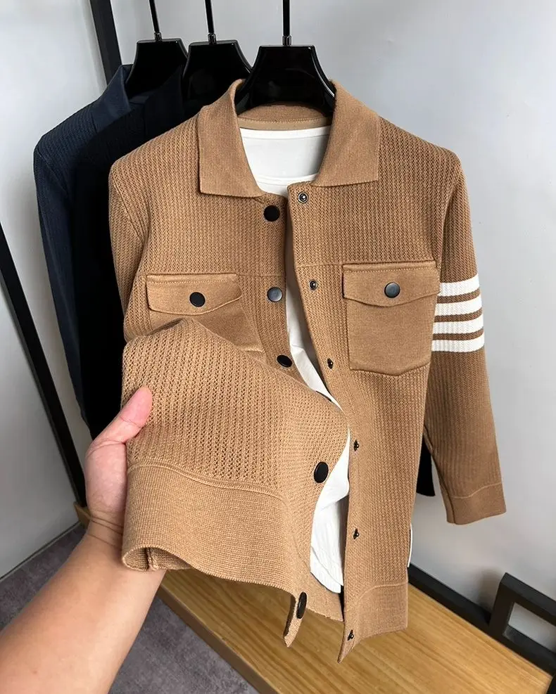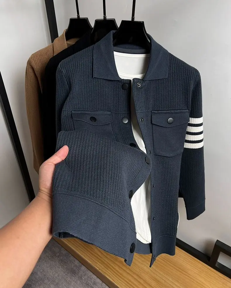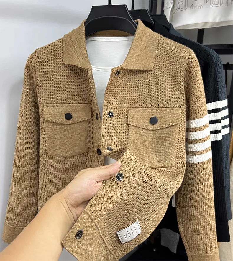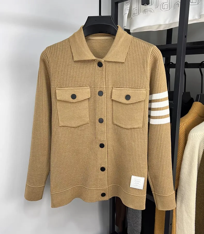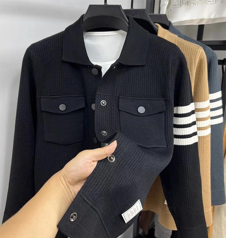 Light luxury men’s knitted cardigan autumn winter fashion brand striped pocket Korean style high-end design casual jacket coat