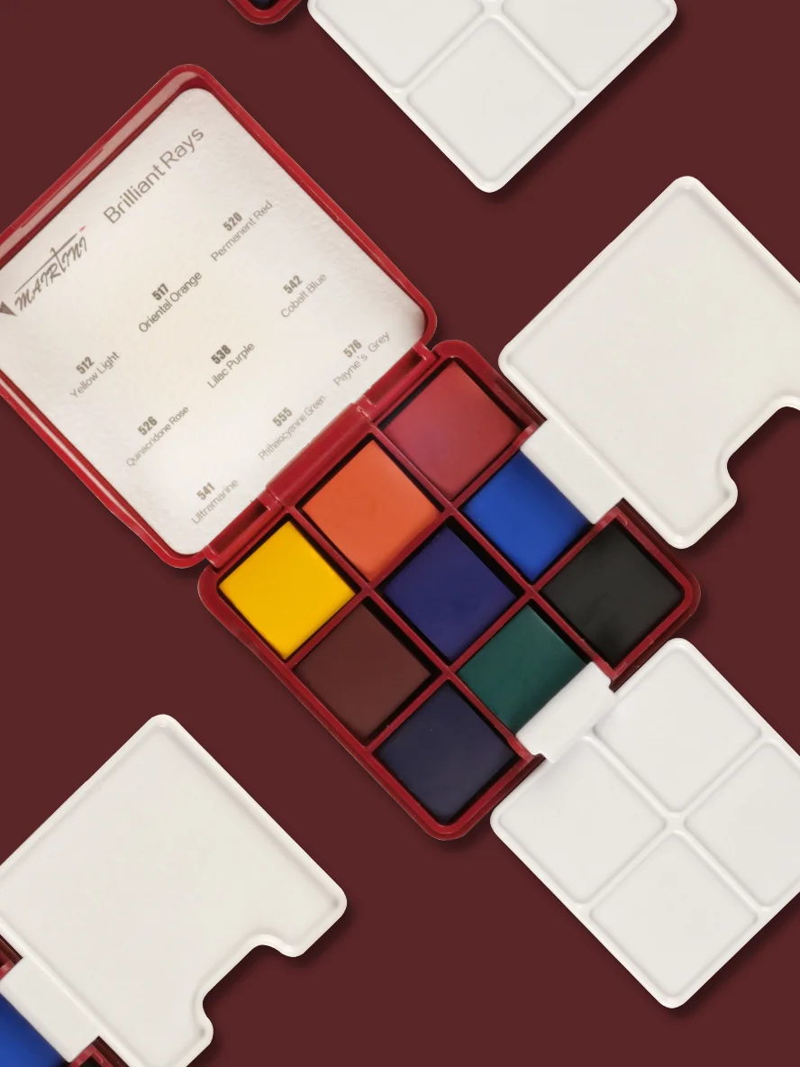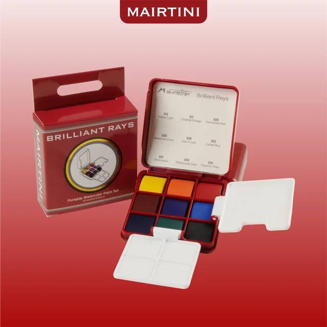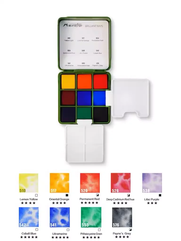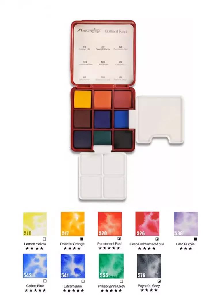 Mairtini Watercolor Set – 9 colors: 512 Yellow Light, 517 Oriental Orange, 520 Permanent Red, 526 Quinacridone Rose, 538 Lilac Purple, 542 Cobalt Blue, 541 Uitramarine, 555 Phthaiocyanine Green, 576 Payne's Grey