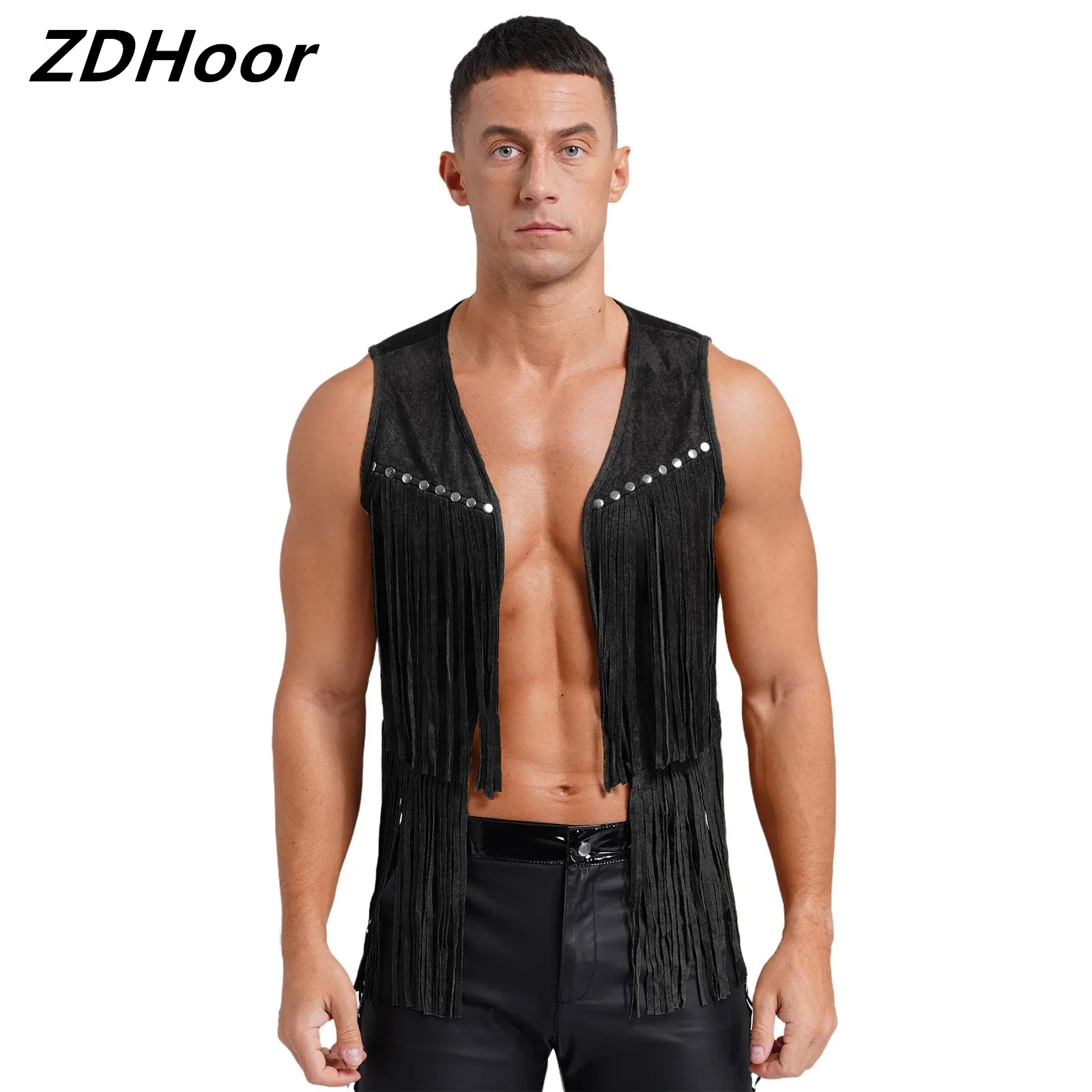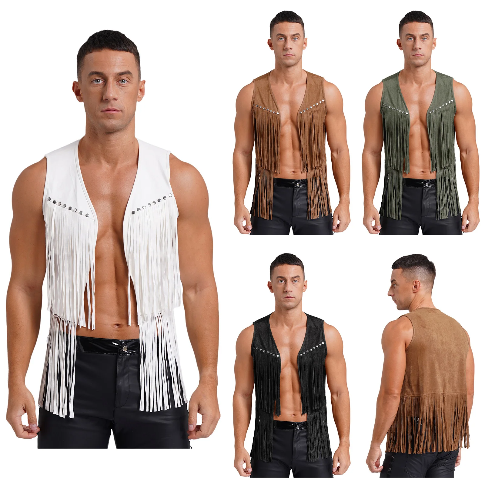 Mens Faux Suede Tassel Vest Western Cowboy Vest Fashion Rivets Fringe Waistcoat Open Front Sleeveless Jacket