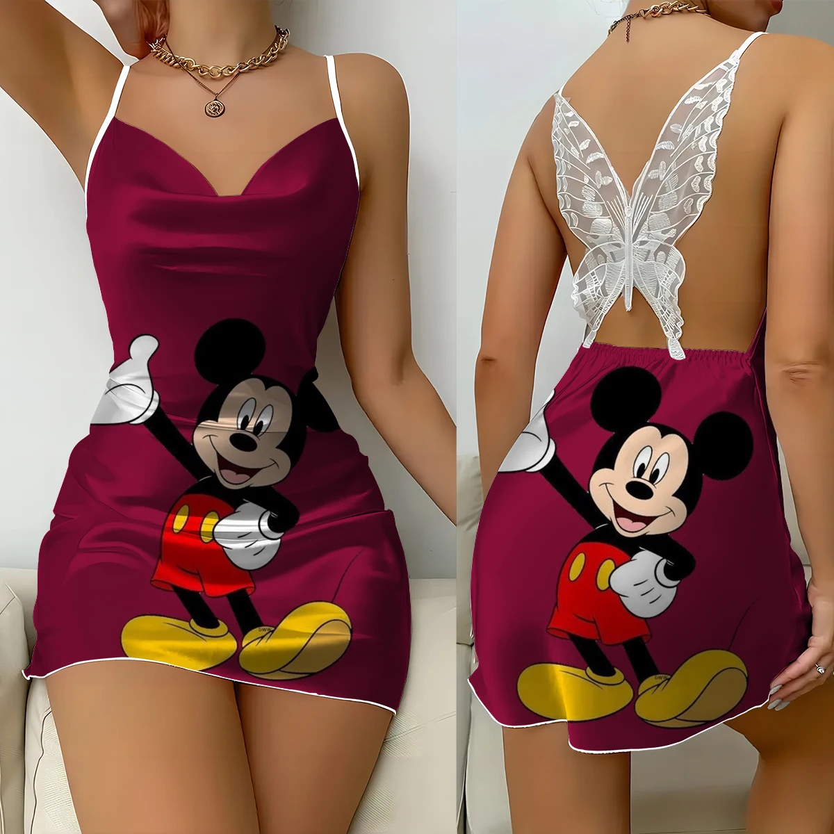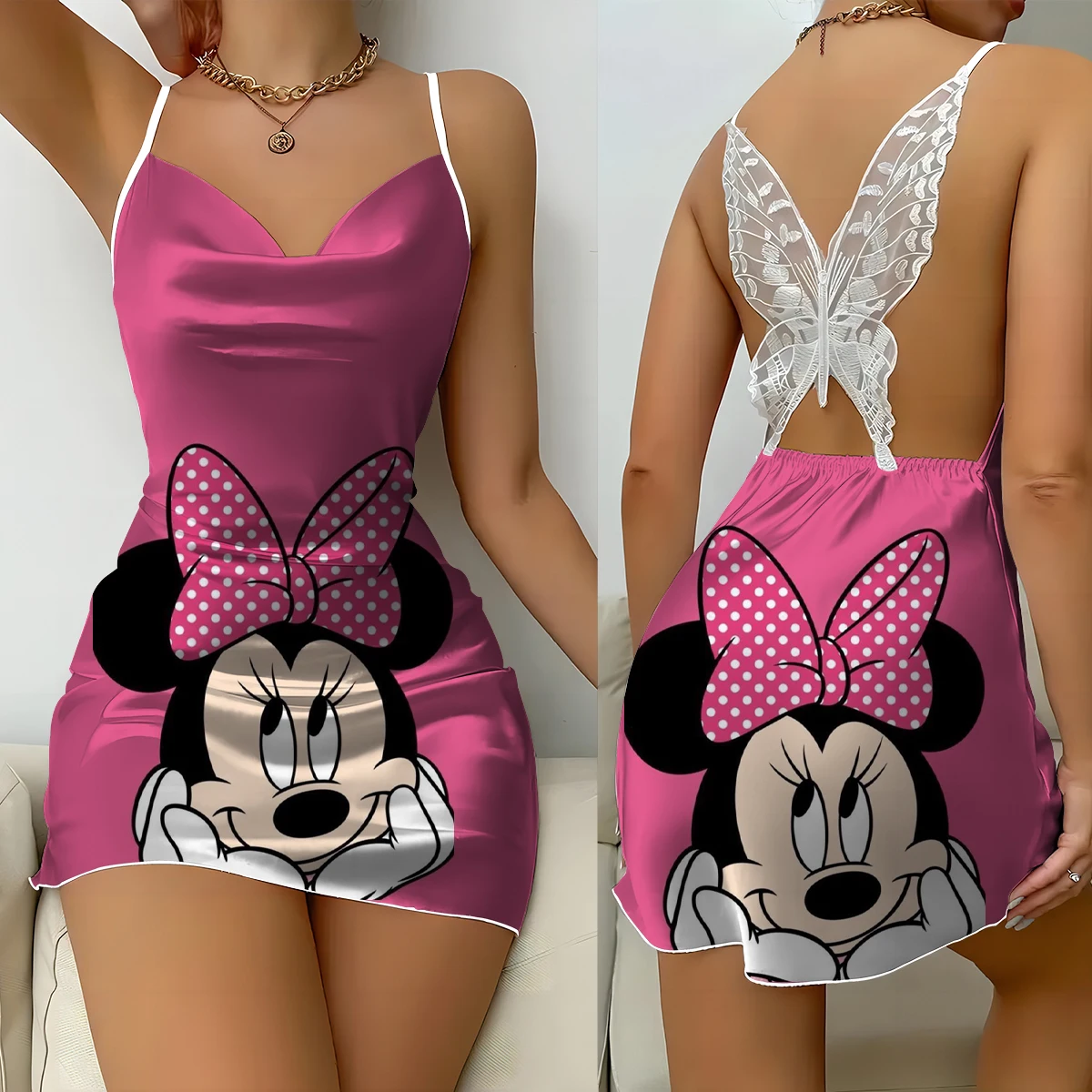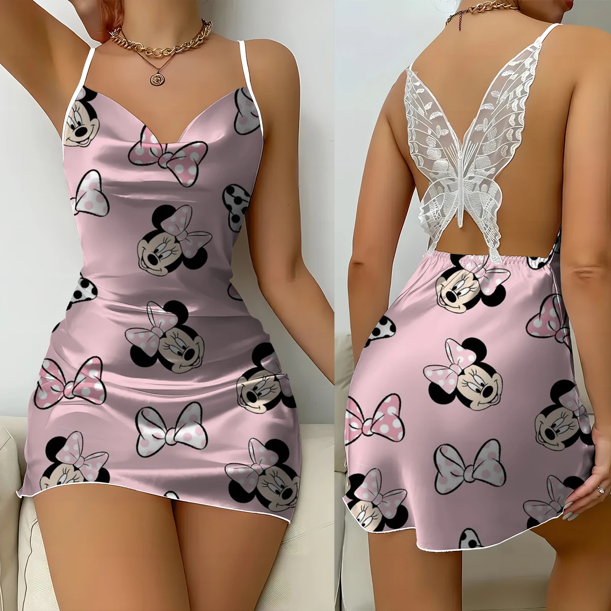 Mickey Mouse Minnie Print Satin Suspender Nightdress V Neck Backless Mini Nightdress Women’s Pajama Dress