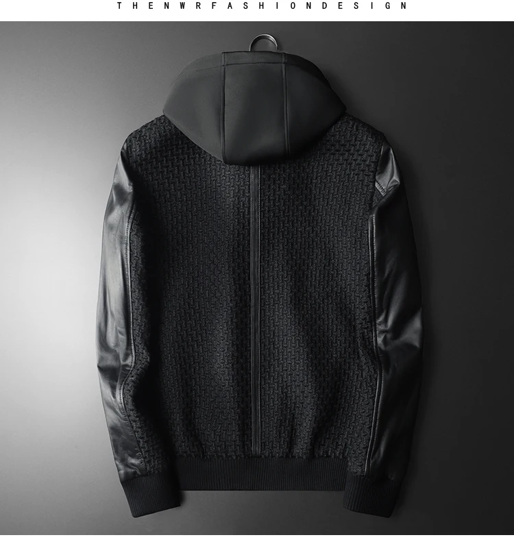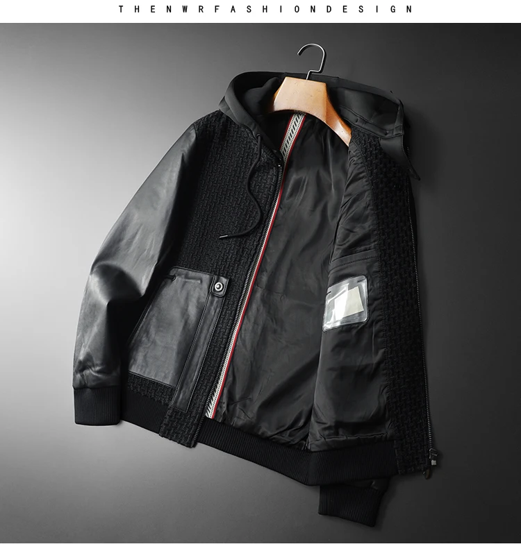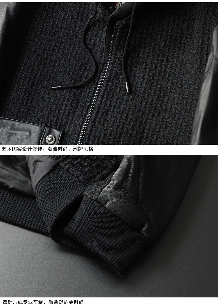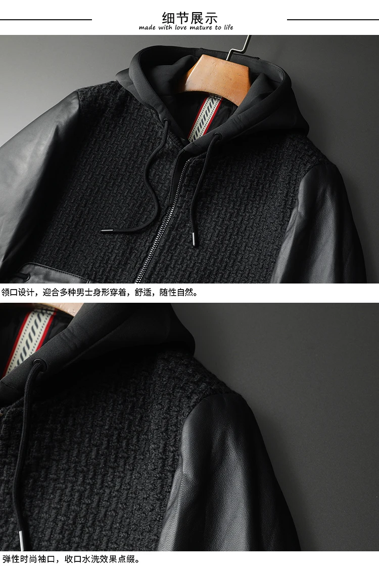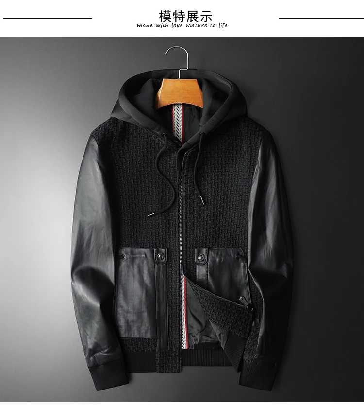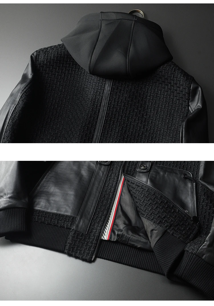 Minglu Autumn Winter Goatskin Men’s Jackets High Quality Solid Color Hooded Genune Leather Male Coats Zipper Casual Man Overcoat
