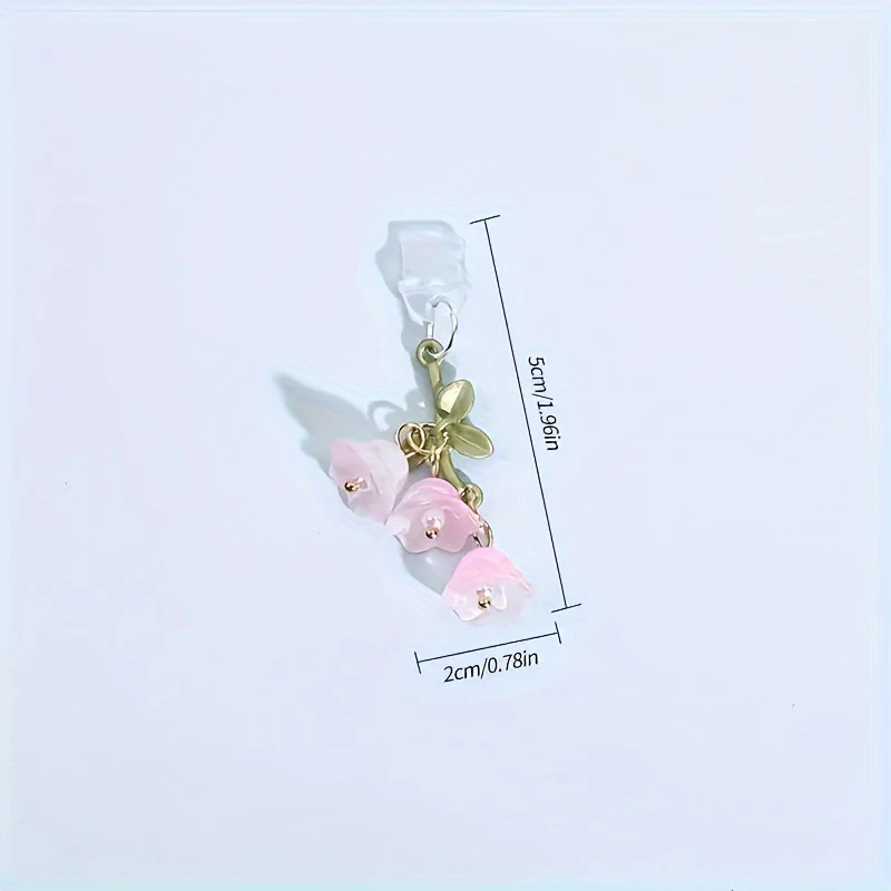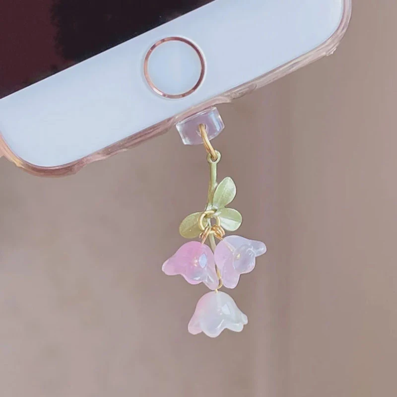 Cute Pink Lily Of The Valley Phone Charm, Flower and Green Leaf Dust Plug, Mobile Earphone Rubber Jack Dust Plug, for Phone/Type C