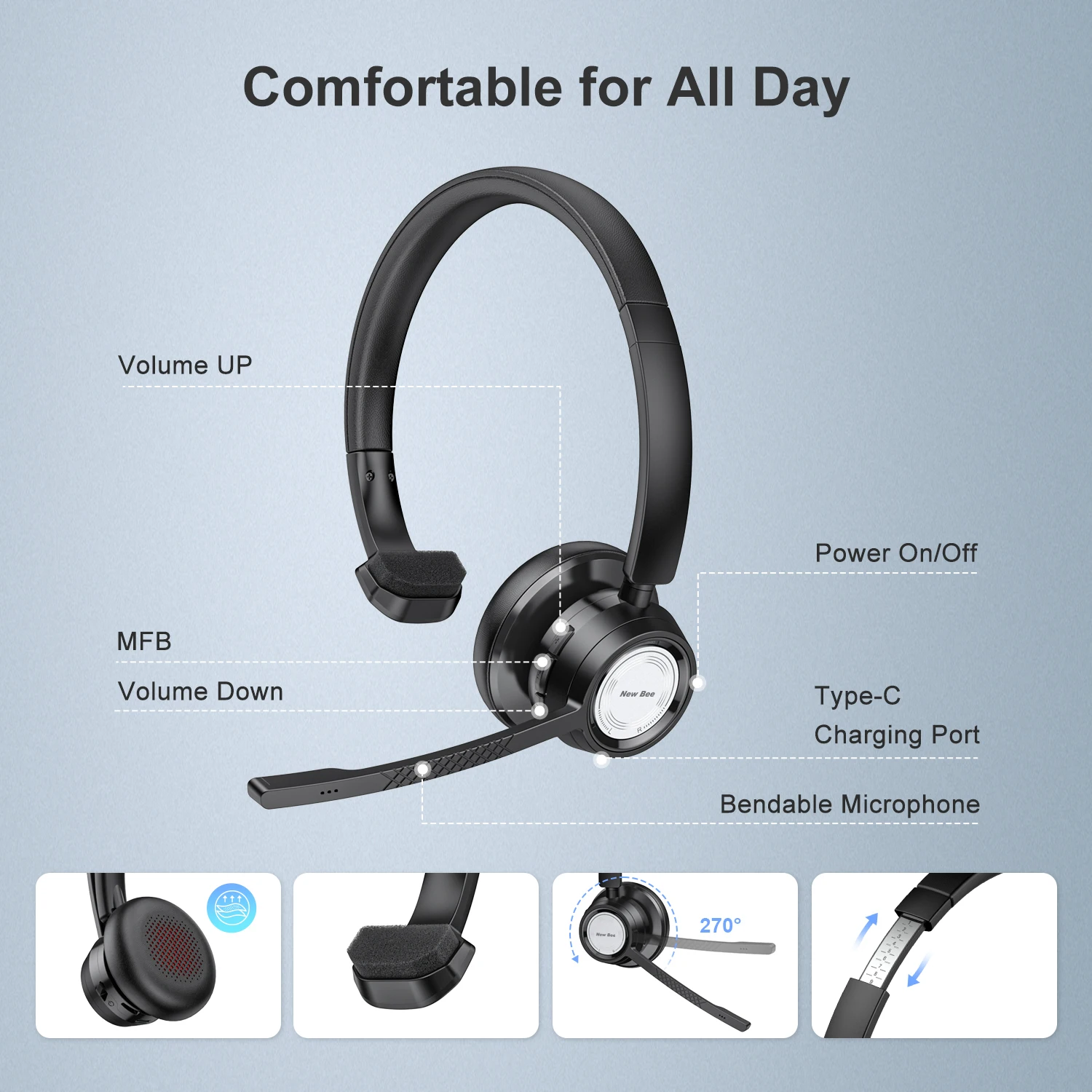 CVC8.0 noise cancellation technology effectively eliminates echoes and ambient noise, 270-degree rotating microphone pole, high-definition pickup, providing clear sound quality. Users can adjust the microphone angle by bending the microphone pole according to their own wearing needs.