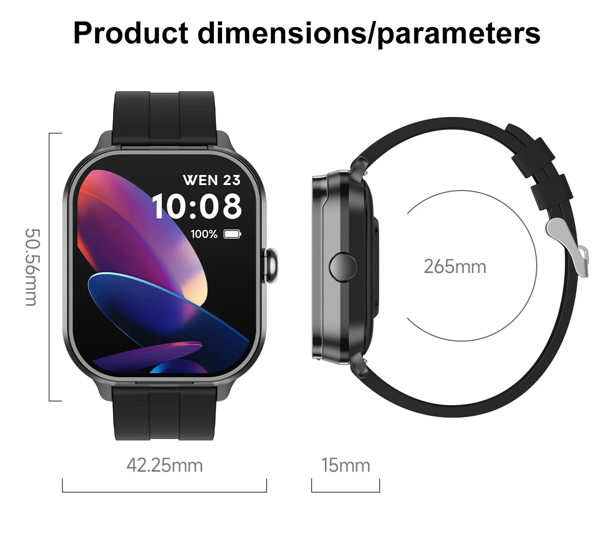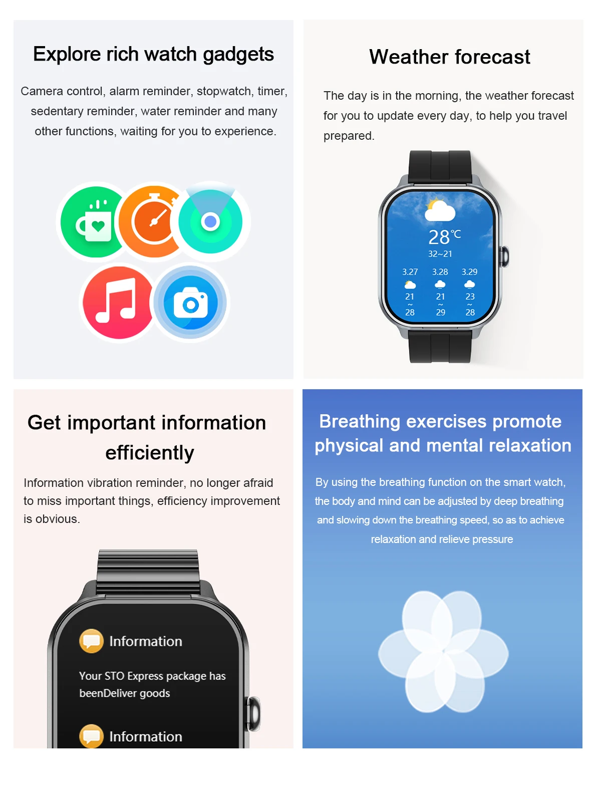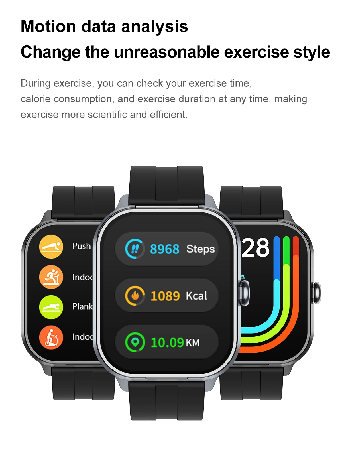 ★ Other features: Bluetooth Calling, language switch, dial selection, Music Control, weather display, time display,compass,female reminderetc.
