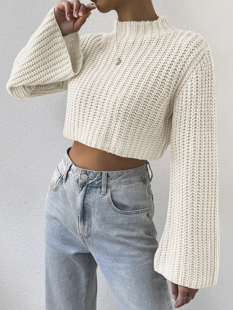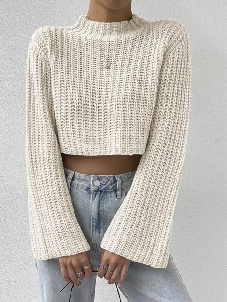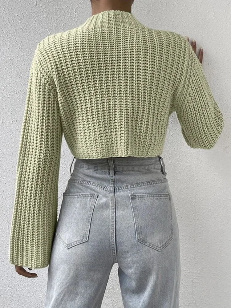 New Korean Style Solid Cropped Sweater Women Vintage Oversize Knit Jumper Fmale Autumn Long Sleeve O-neck Pullovers Tops