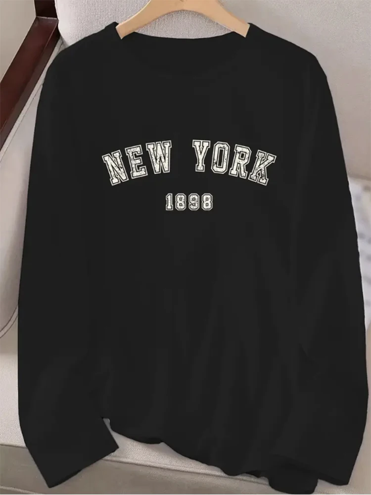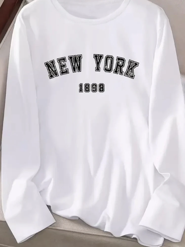 New York Print Women Long Sleeve T-shirt Casual Loose Crew Neck White T-Shirt 2024 Autumn Every Day Female Soft Bottom T-shirt