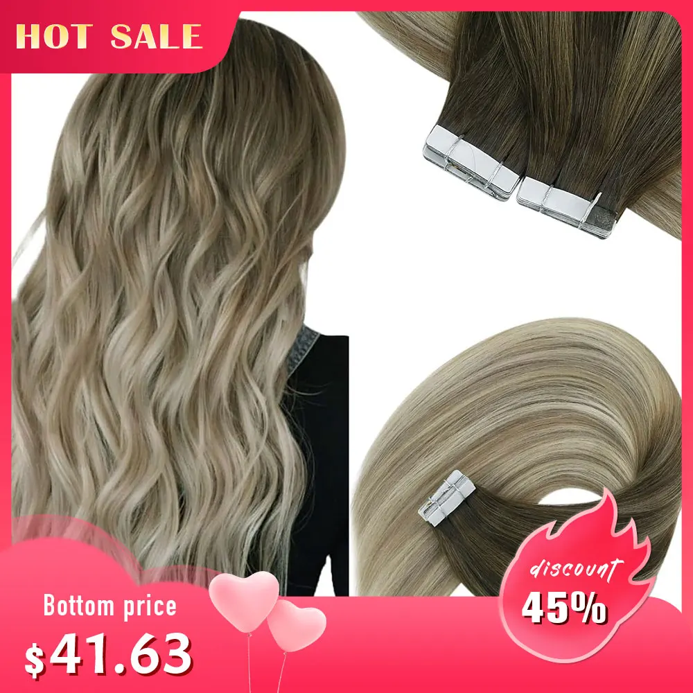 [NEW]VeSunny Tape In Hair Extensions Human Hair Real Natural Hair Balayage Color #4-14-60 Skin Weft Straight Seamless Hair