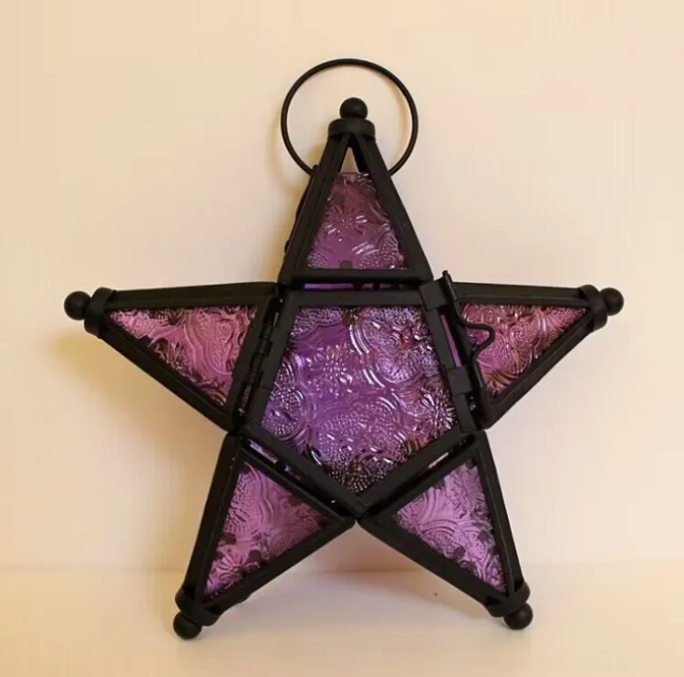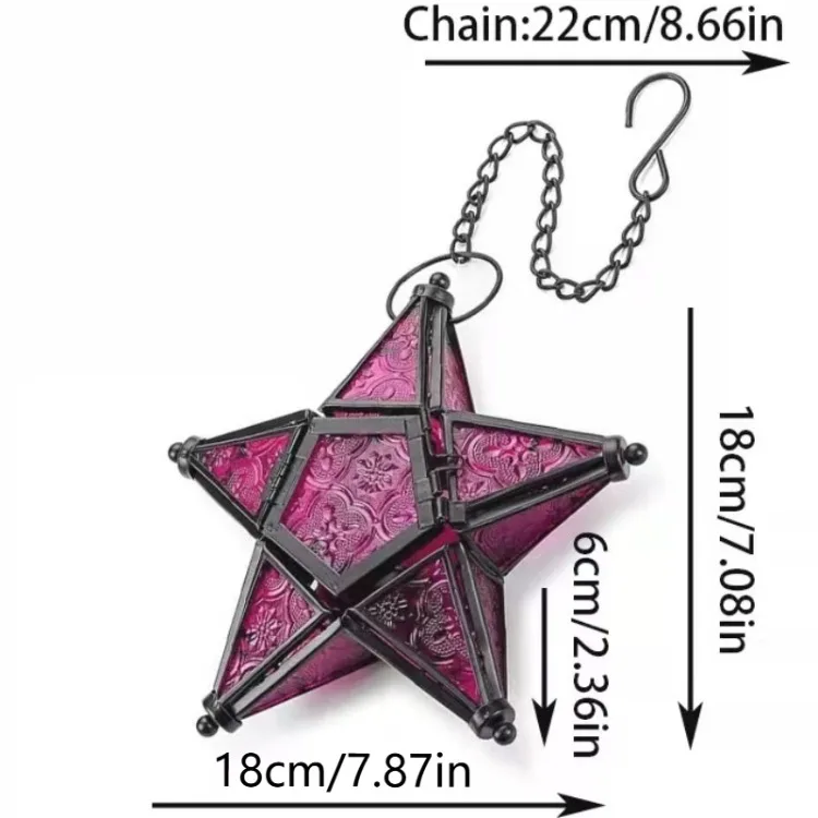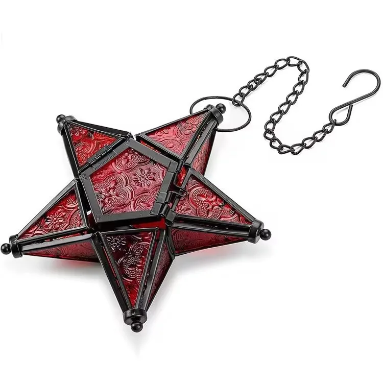 Nordic Retro Iron Art Colored Glass Wind Lamp Windproof Glass Candle Holder Hanging Five Pointed Star Candlestick Garden Decor