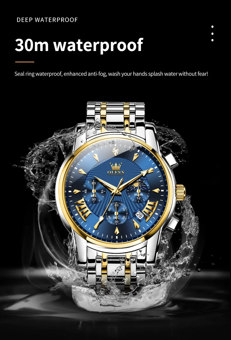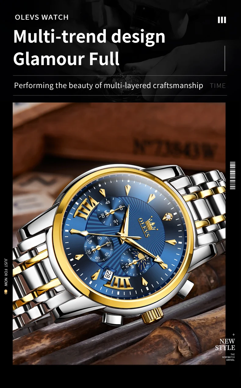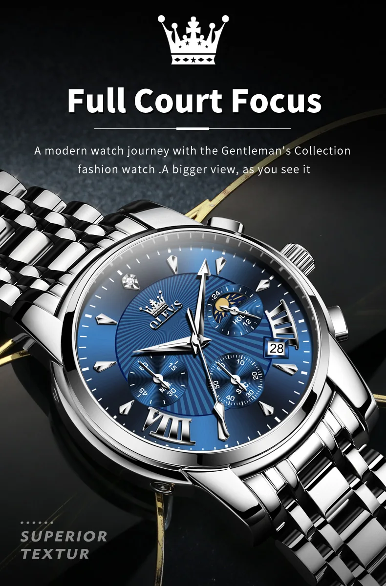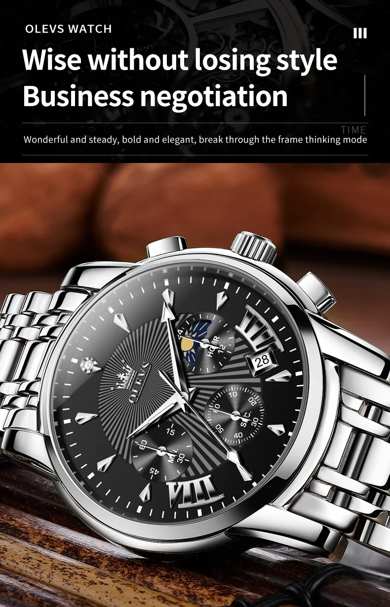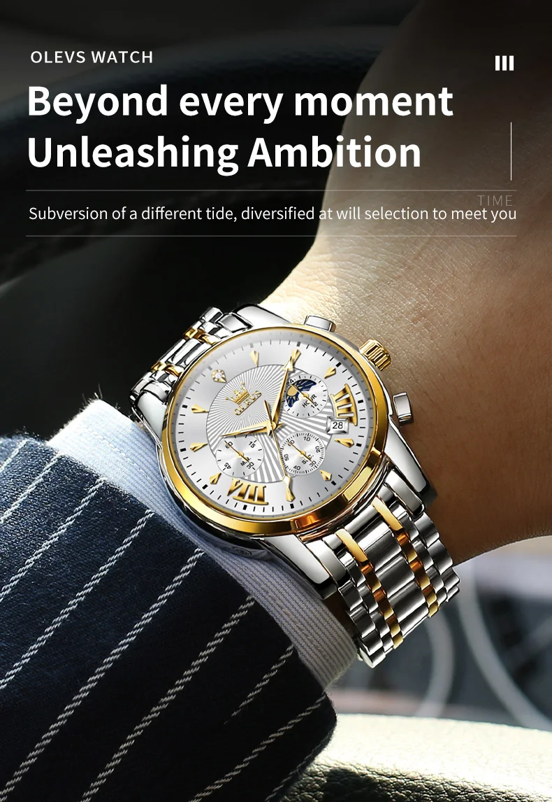OLEVS 2892 Multi-function Waterproof Watches For Men, Stainless Steel Strap Quartz Fashion Men Wristwatches Moon Phase