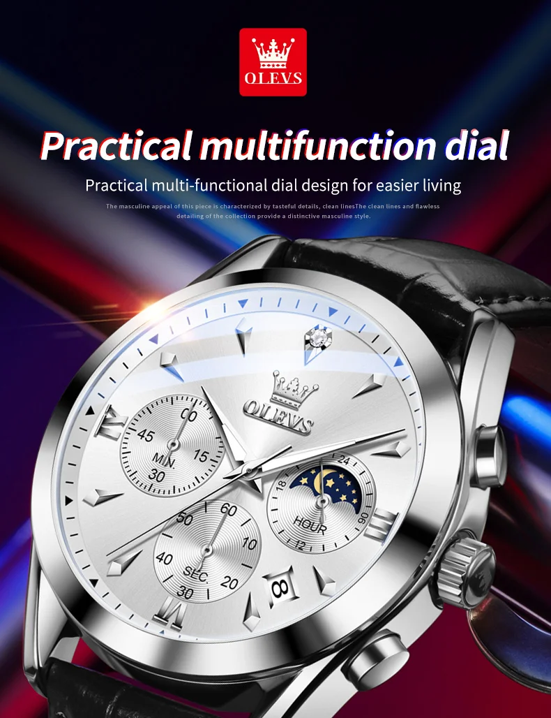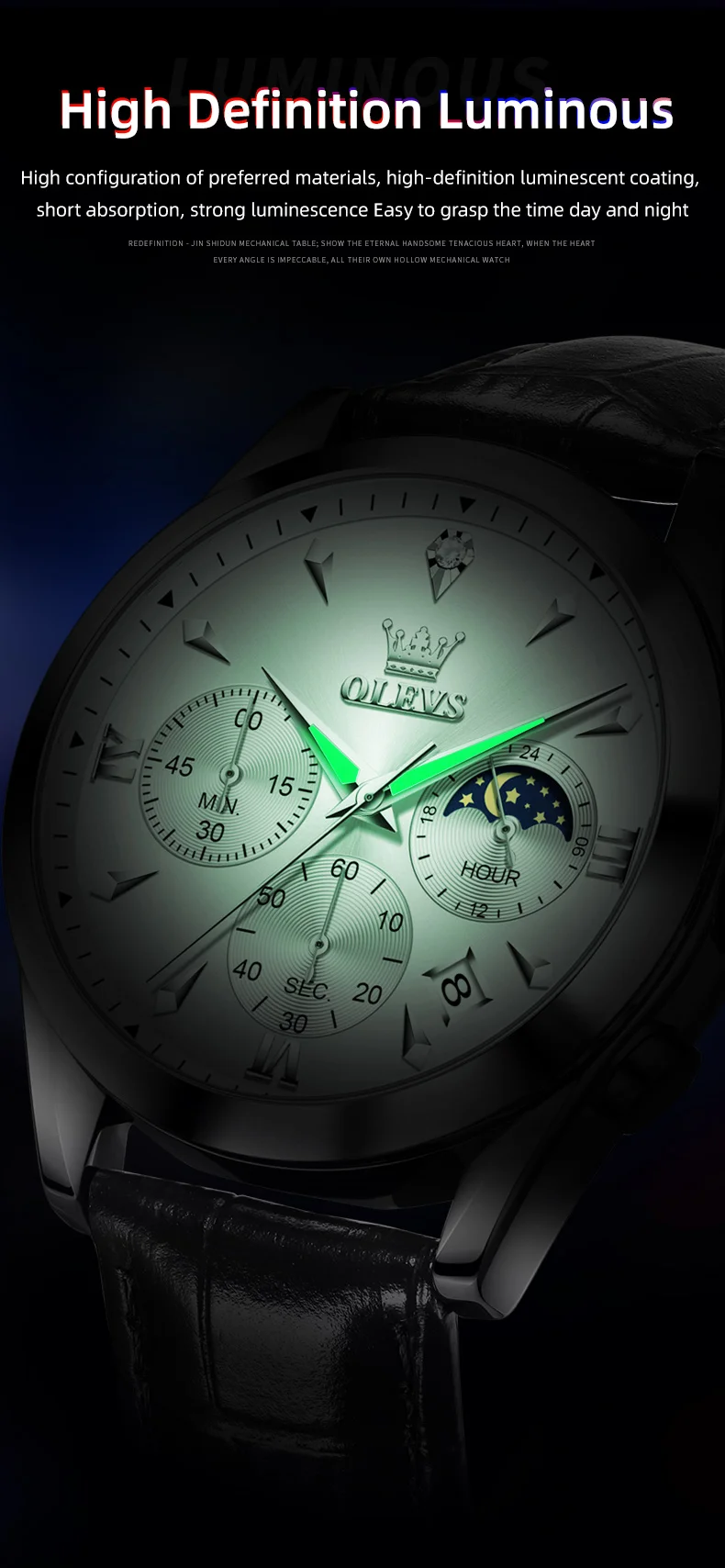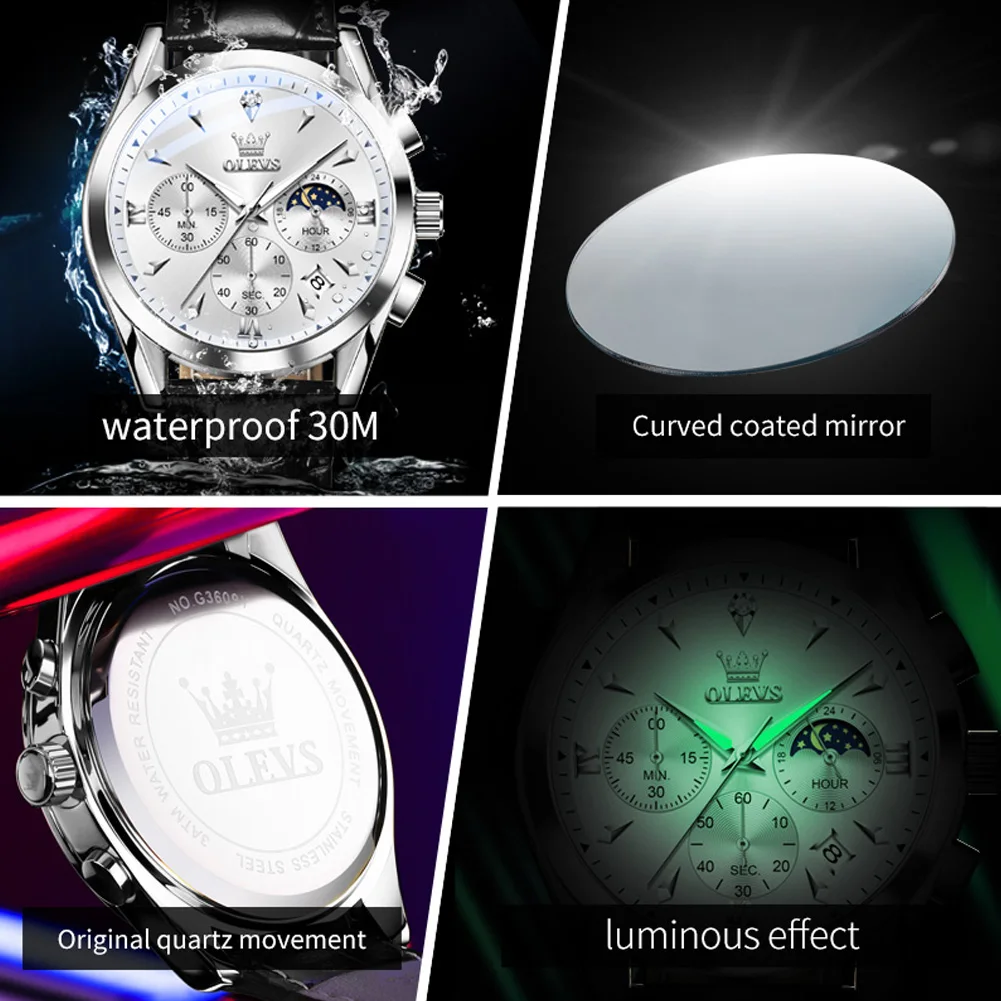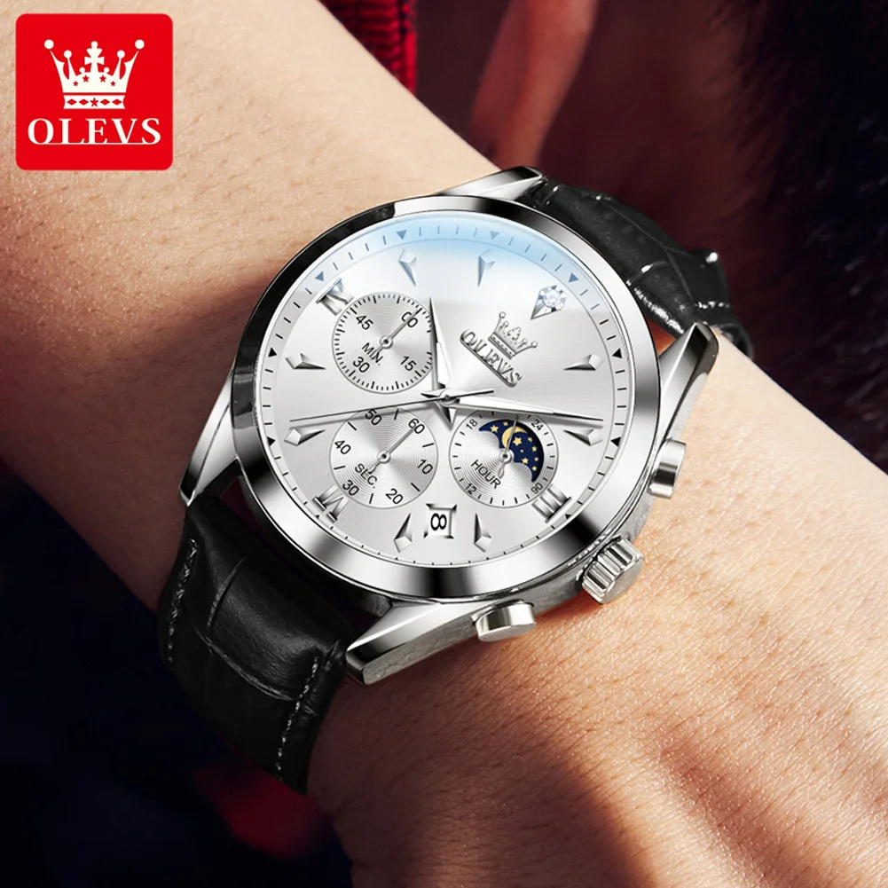 OLEVS 3609 Moon Phase Original Man Wristwatch Chronograph Quartz Watch For Men Waterproof Luminous Luxury Business Watches 2024