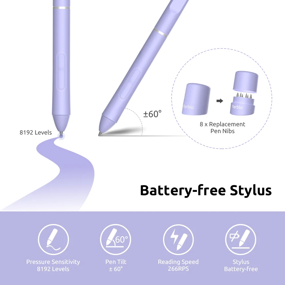 8192 PRESSURE SENSITIVITY: The graphic tablet has wireless passive electromagnetic induction technology with a battery-free pen that doesn’t require charging. 8192-level pressure sensitivity and 8-10mm reading heights, support pen tilt sensing function, tilt angle up to ±60 degrees, for a more delicate painting experience