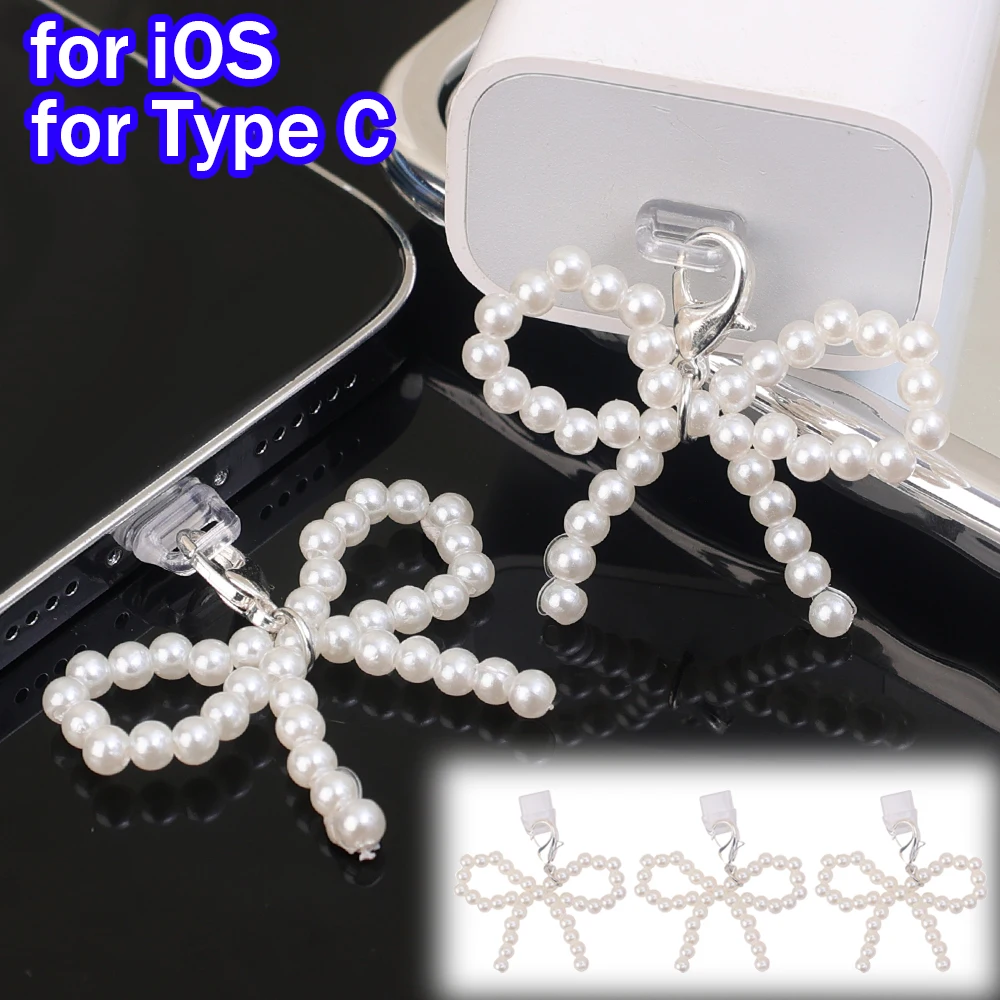 Pearl Bowknot Mobile Phone Dust Plugs DIY Anti Dust Charger Port Plugs Protector Pendant Cap for Apple IPhone 14 Android Type C