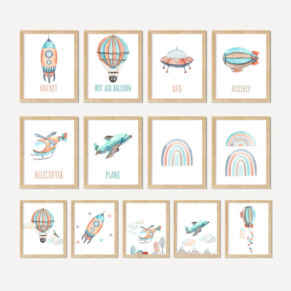 Rainbow Rocket Airplane Hot Air Balloon Wall Art Travel Nursery Posters Kids Canvas Print Decorative Paintings Baby Boy Room Decor Pictures