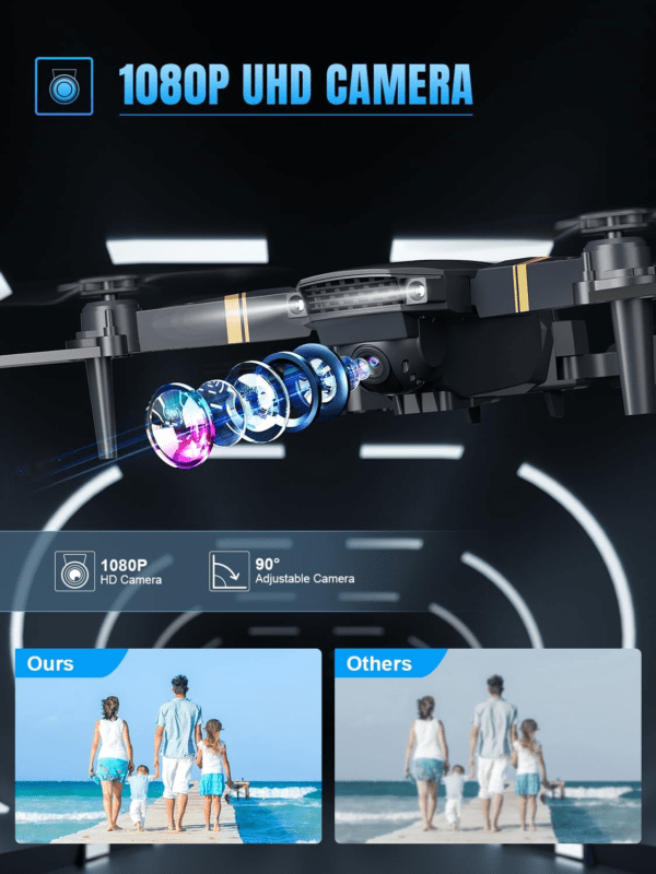 • ➤【 Drone With 1080P HD Camera 】The E58 drone is equipped with a 120° Wide-angle 1080P HD Camera including adjustable angle, which captures high-quality video and clear aerial photos. The Wi-Fi real-time transmission FPV system can connect to your phone with the drone and the view will be captured and directly saved on your phone, share the amazing view to social media with just one click.
