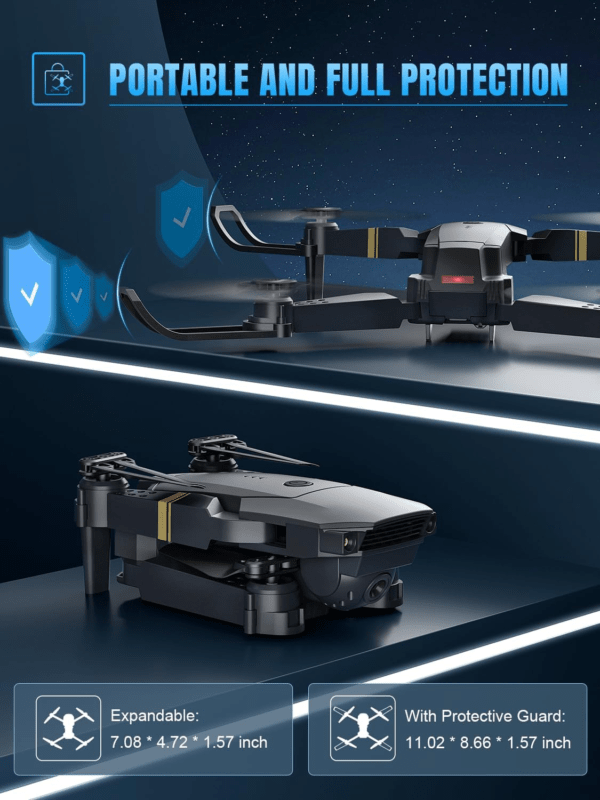 • ➤【Portable & Safe】Thanks to the foldable design, the E58 drone can be easily stored in a handbag for outdoor carrying. The drone arm can be replaced. When the motor or drone arm is damaged, just replace the drone arm and it can fly again. In addition, the drone is equipped with 4 propeller guards that fully protects the propellers and improves flight safety.