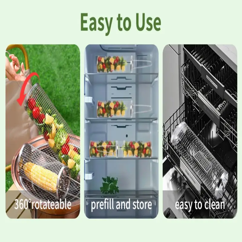 Round BBQ Basket Stainless Steel Rolling Grilling Basket Wire Mesh Cylinder Grill Basket Portable Outdoor Camping Barbecue Rack