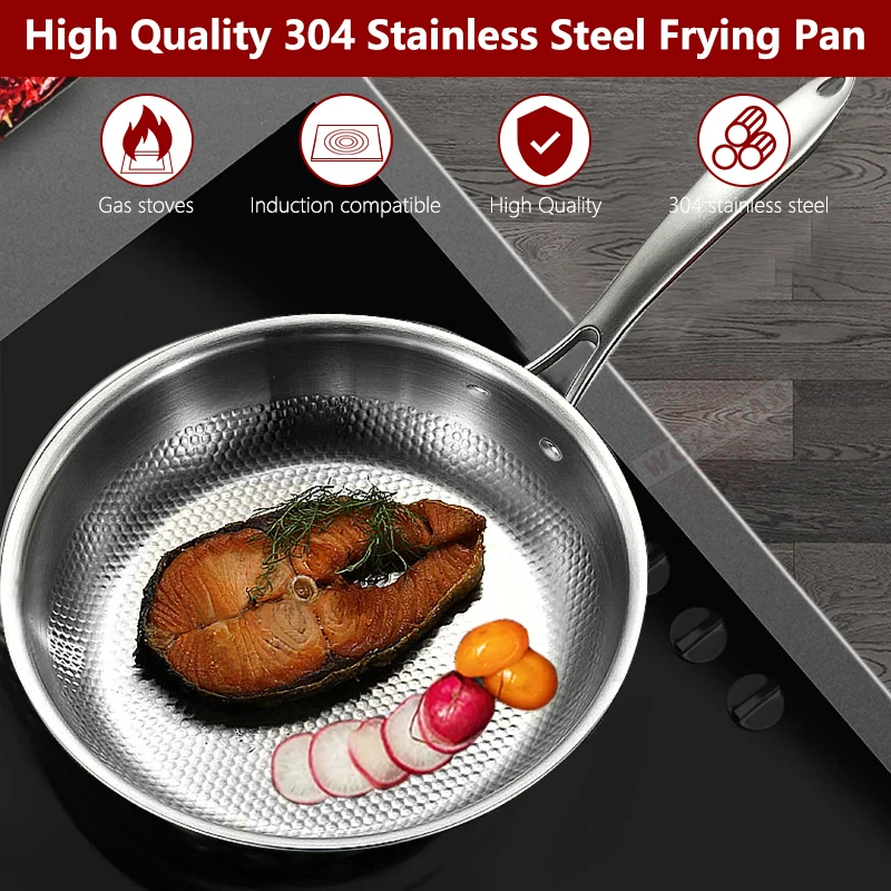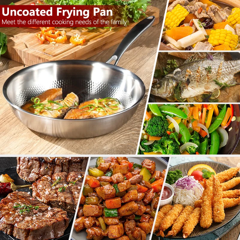 ● Food-Safe 304 Stainless Steel: Elevating flavor authenticity and providing a gratifying frying experience, our food-safe 304 stainless steel sauté pan is resistant to corrosion, ensuring no residual odors or tastes. With natural post-cooking patina, effortless cleaning is assured—simply wipe the stainless steel fry pan with stainless cleaner, baking soda, or refreshingly boil with a vinegar-water solution.