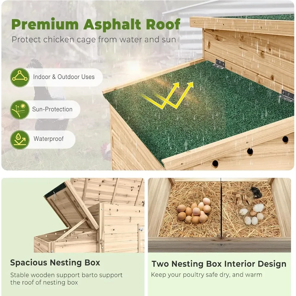 - 【Large Nesting Box】 A 2-part nesting box on the side of the chicken coop provides space for your hens to lay their daily eggs; The top hinged roof of the nesting box could be openned or closed with a lid cover and easy to lift to collect eggs