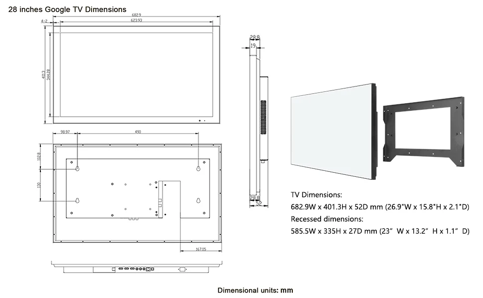 【Hassle-Free Installation】 Mount your TV effortlessly using the included wall-mount bracket, or use your existing VESA bracket for flexible placement options. Whether on the wall or elsewhere, installation is a breeze. Unit Size: 682.9W x 401.3H x 52D mm (26.9″W x 15.8″H x 2.1″D); Recess dimensions in wall: 585.5W x 335H x 27D mm (23”W x 13.2”H x 1.1”D)