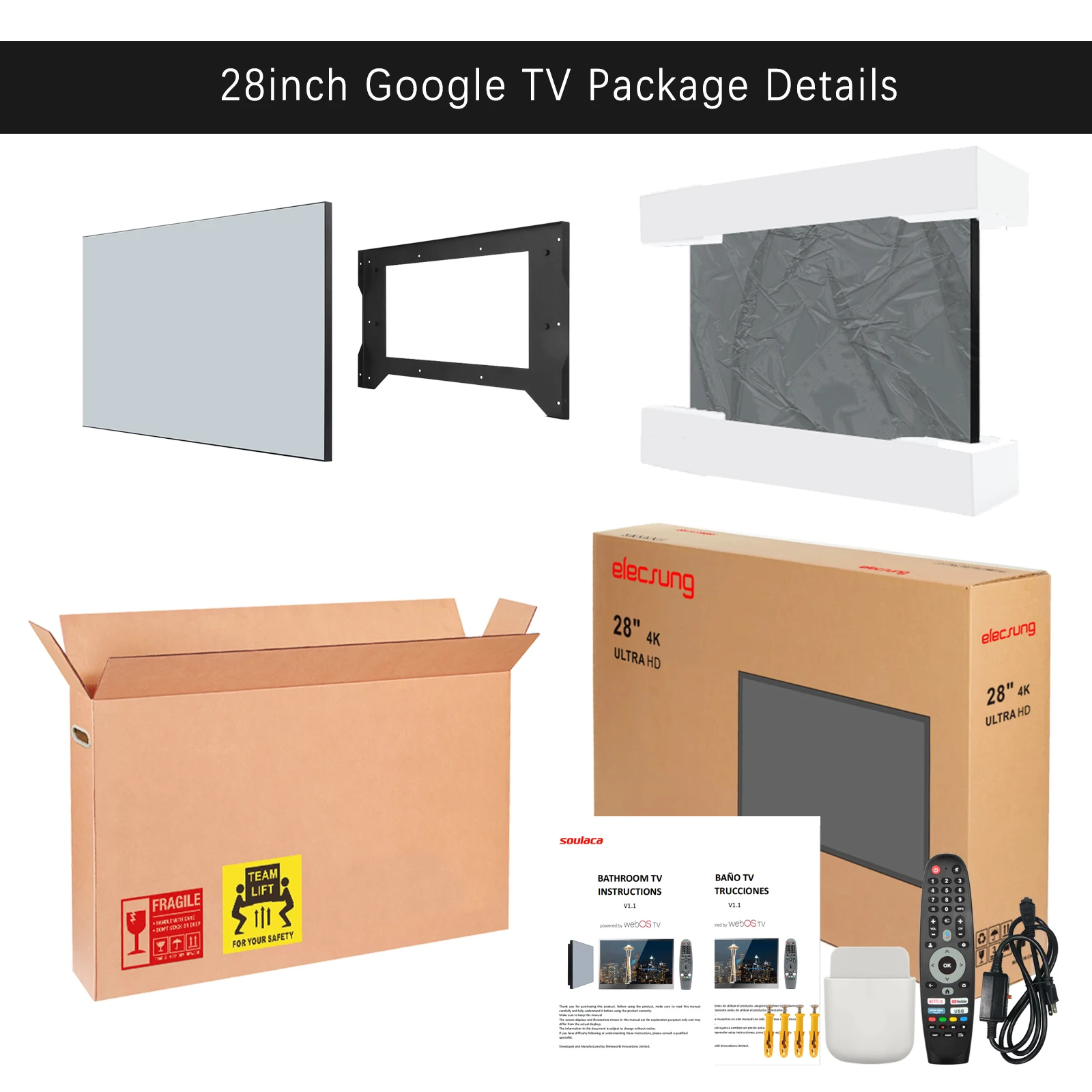 Soulaca 28inch Mirror TV Large Smart TV Mirror 4K Screen Vanishing IPX6 Waterproof for Bathroom SPA Google System WiFi Bluetooth