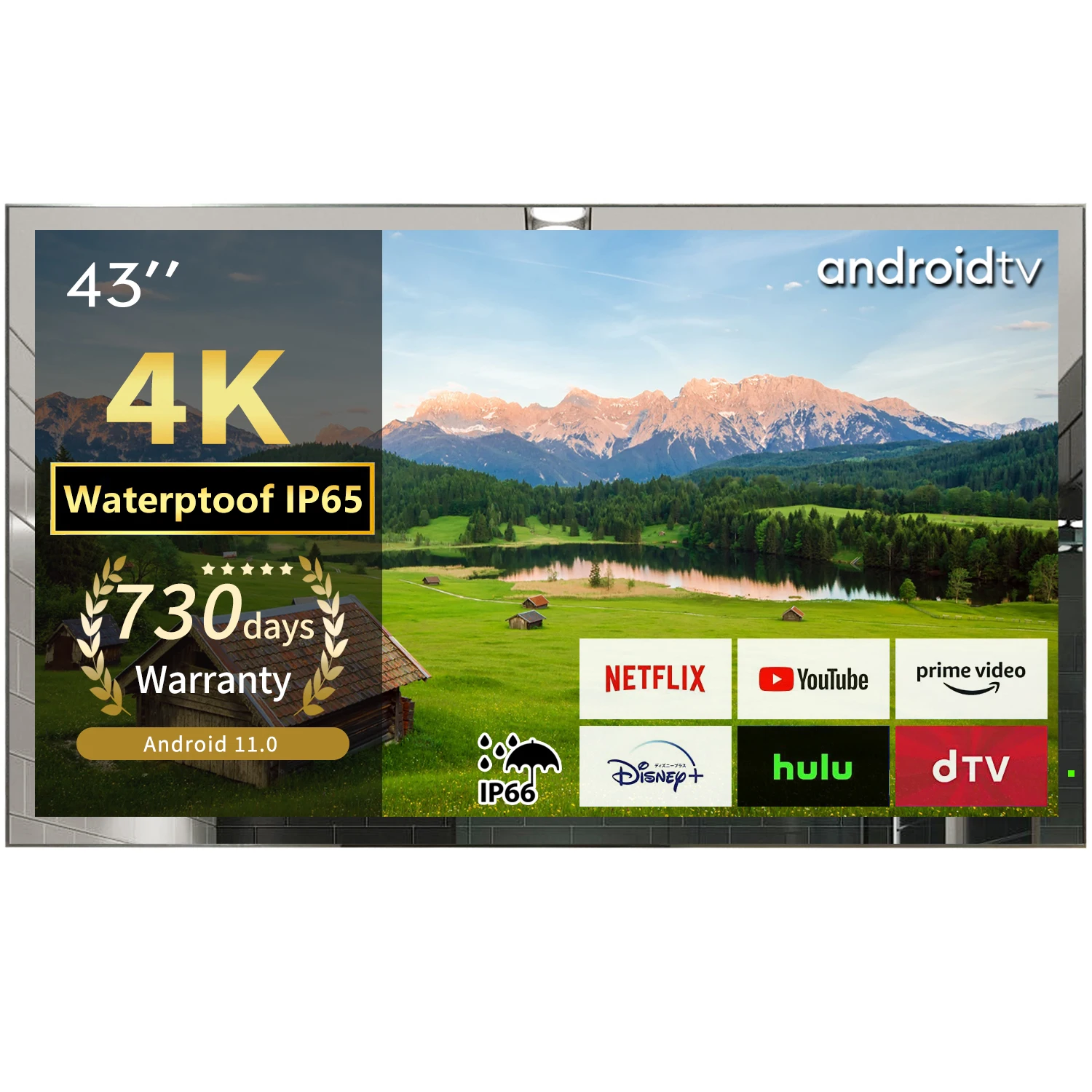 43”Android 11.0 updated waterproof smart TV. This is not just a TV, not just a mirror. It’s a mirror TV. Hidden behind a mirror made of tempered glass.