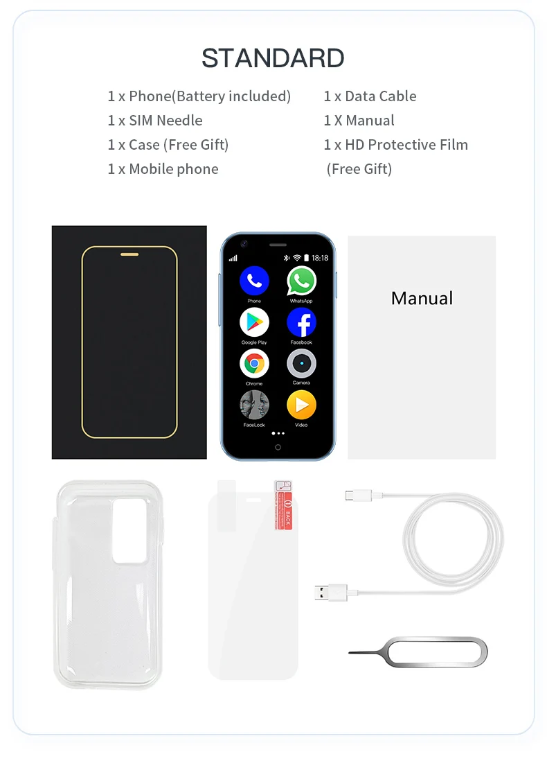 * With 64G TF card = 1*Phone+1*USB cable+1* Manual+1*Display protector+1*Phone case+1* 64G Memory card