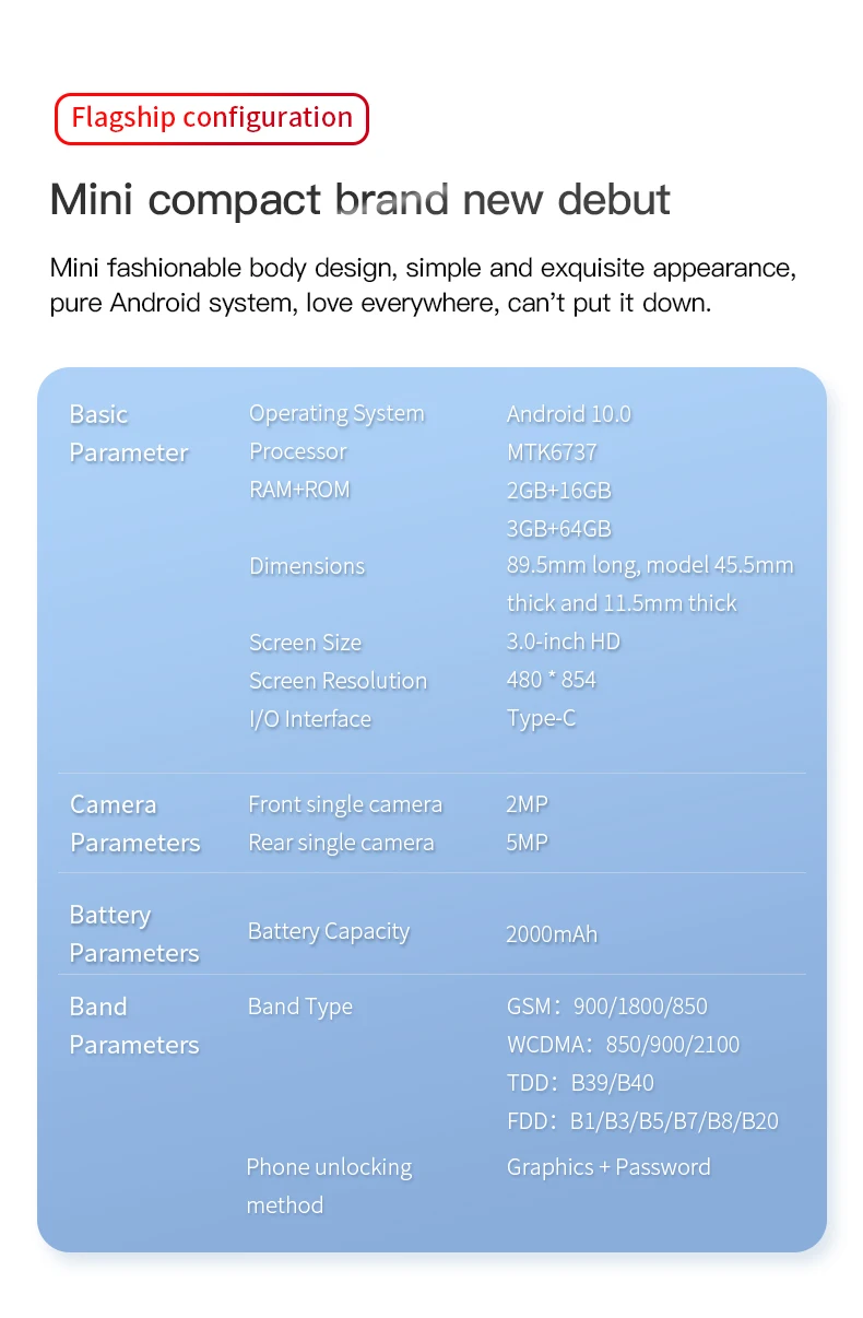 1. 3.0 Inches Mini Size Android 10.0 Smartphone ;