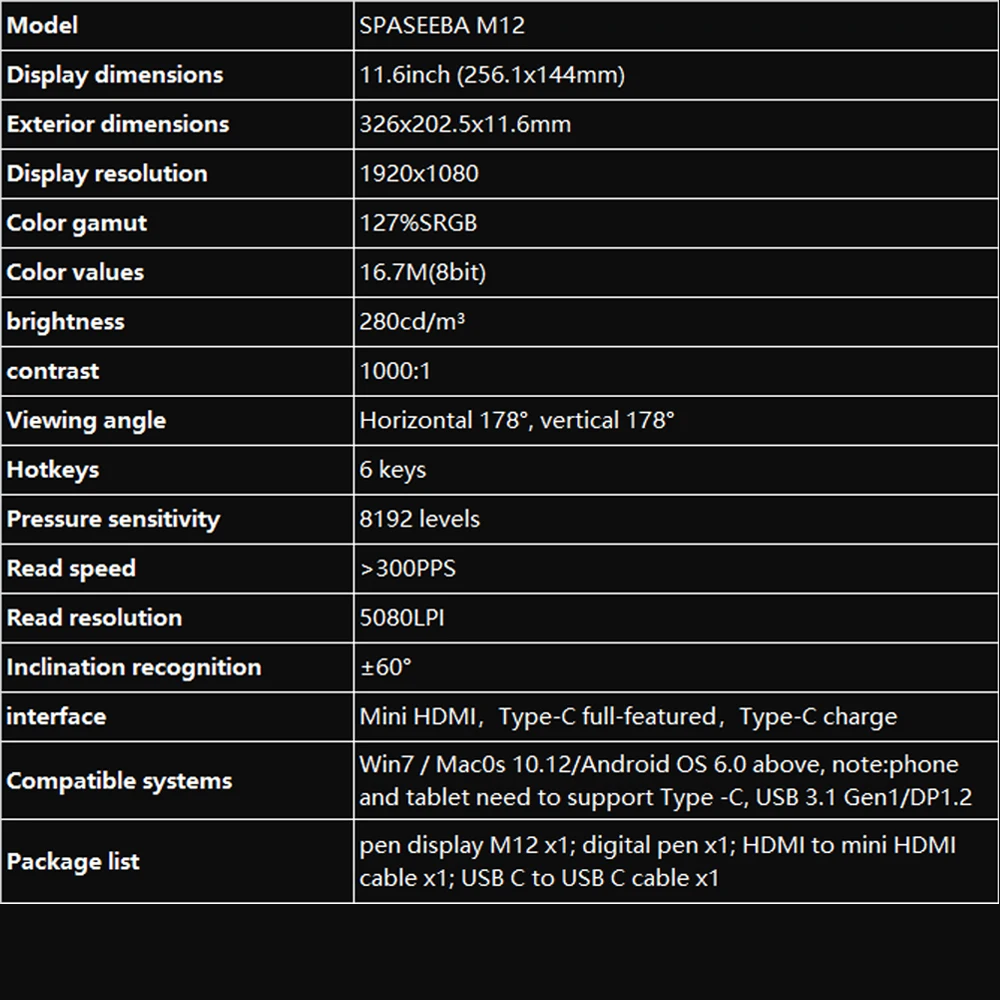 SPASEEBA M12 Graphics Drawing Tablet Monitor, 11.6″ IPS LCD Digital Pen Tablet Display 8192 Level Support Windows Mac Android OS