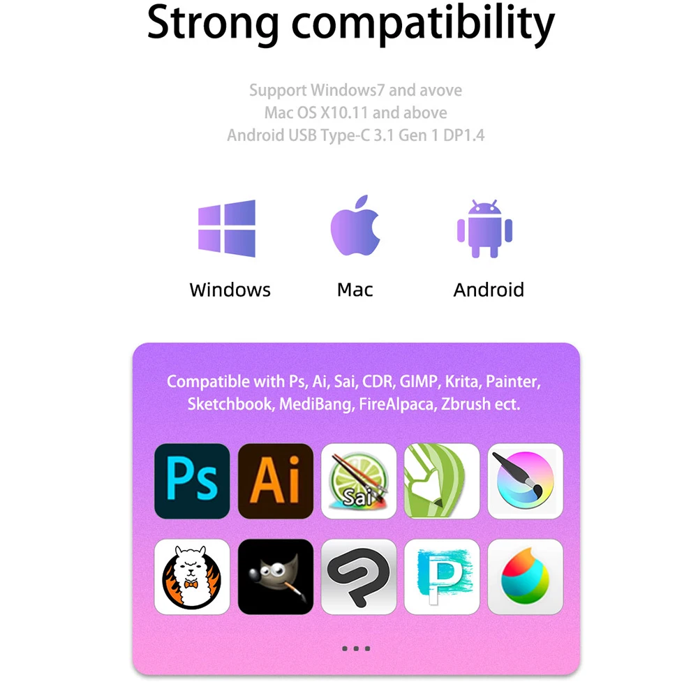 -And it is compatible with most painting software, like Adobe Photoshop, Illustrator, Clip Studio, Lightroom, Sketchbook Pro, Manga Studio, CorelPainter, FireAlpaca, OpenCanvas, Paint Tool Sai2, Krita and so on.