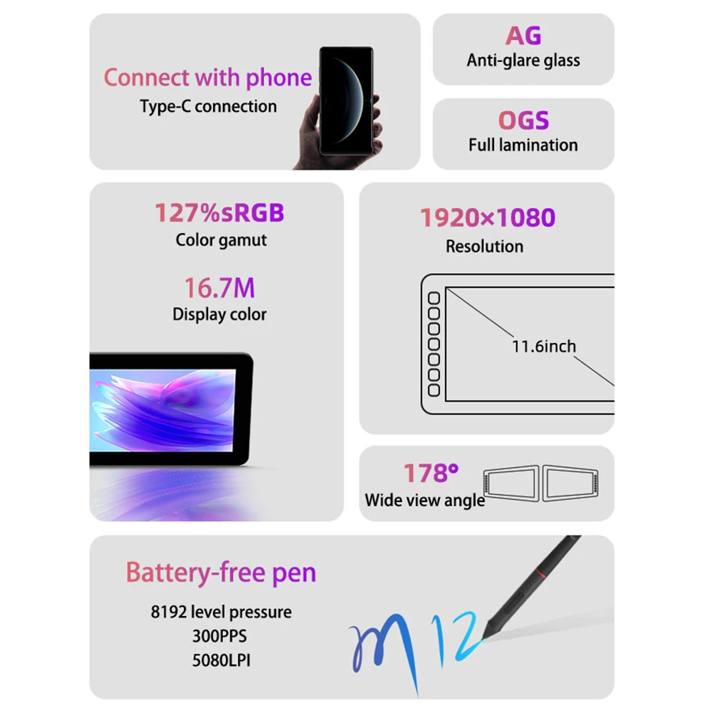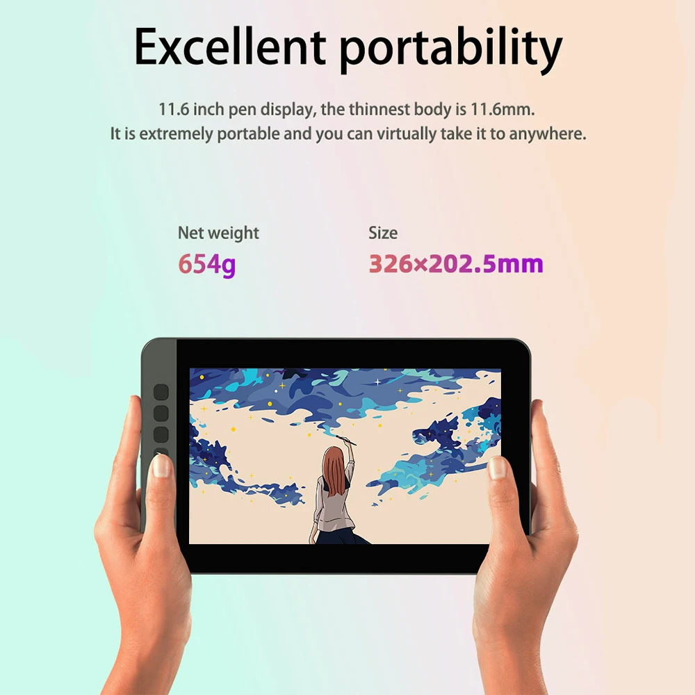 -With 654g net weight, 11.6 inch M12 is engineered for great convenience with carefree creation experience, offering you sufficient working space. And it is easy to carry the pen display to anywhere you need, like the workplace, school, outdoor painting and a temporary trip so that you can use the tablet for on the go creation. You are free to record your inspiration without limits.