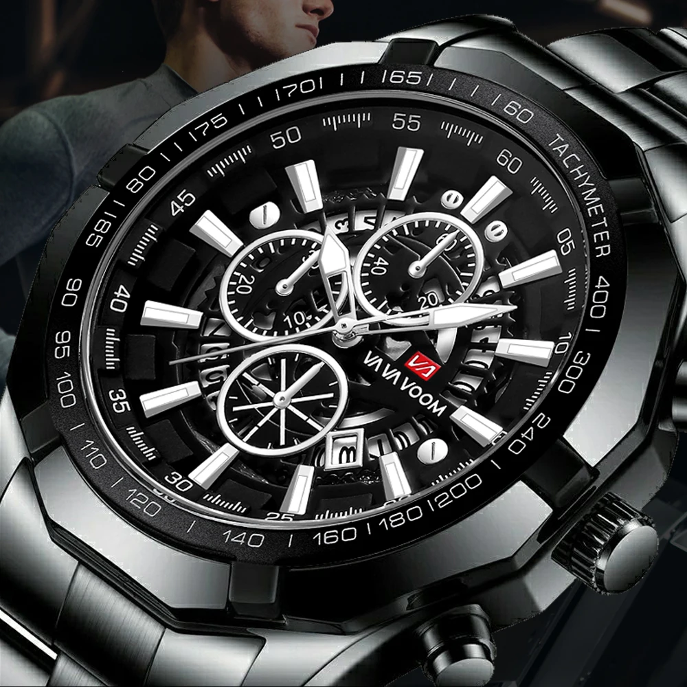 Sports Mens Quartz Watch VA VA VOOM 2023 New Black Stainless Steel Waterproof Hollow Out Luminous Military Mannish Wristatches