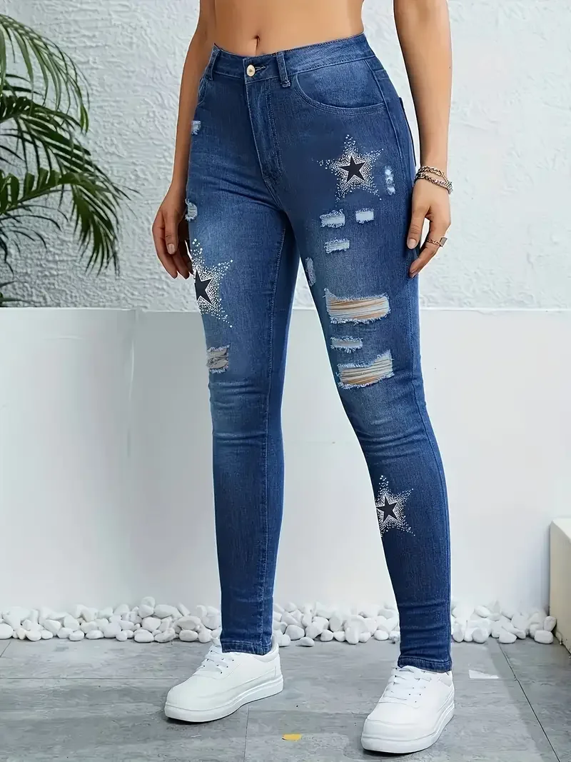 Star Pattern Printed Washed Hole Women’s High Waisted Stretch Denim Skinny Trousers Fashionable Women’s Denim Work Clothes