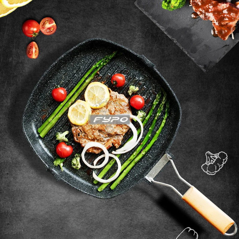 Steak Frying Pan, Cast Iron Non Stick Portable Grill, Deep Square Griddle Pan with Folding Wooden Handles Cooking Pans