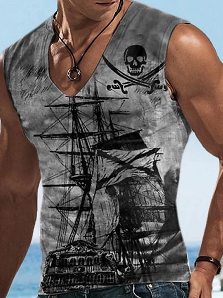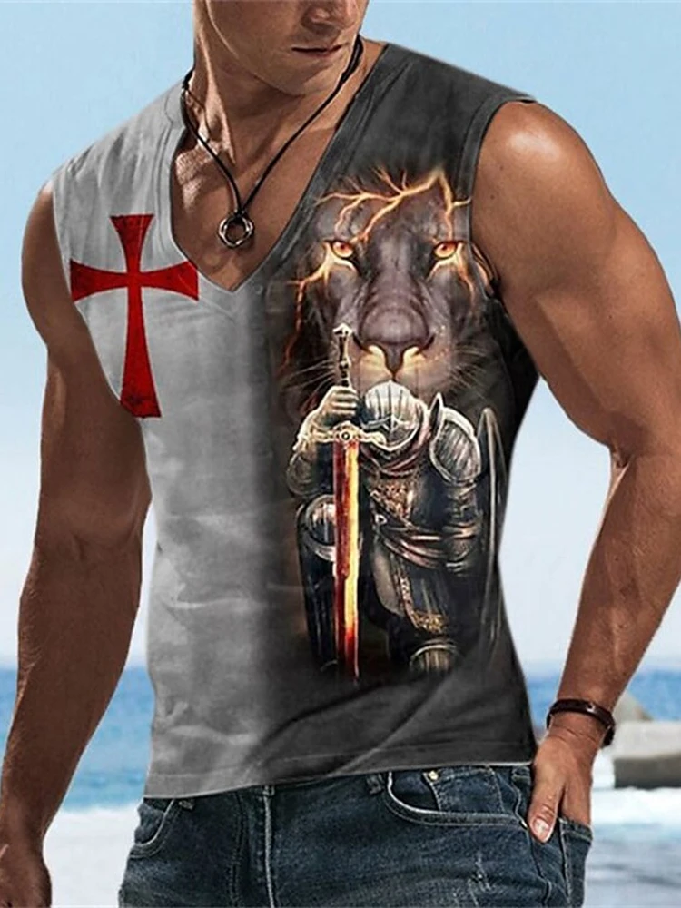 Summer Daily Casual Men’s Tank Top Urban Street Style Fashionable Men’s V-neck Tank Top Outdoor Sports Men’s Top Lion Cross Prin