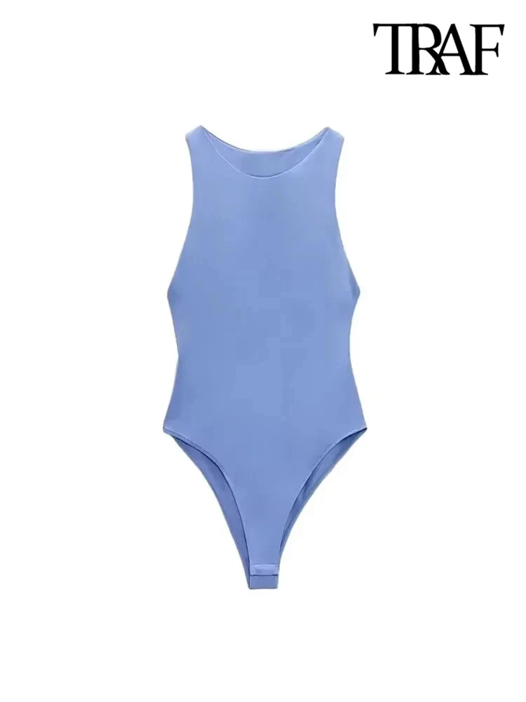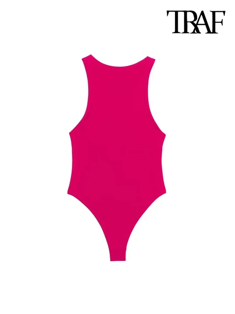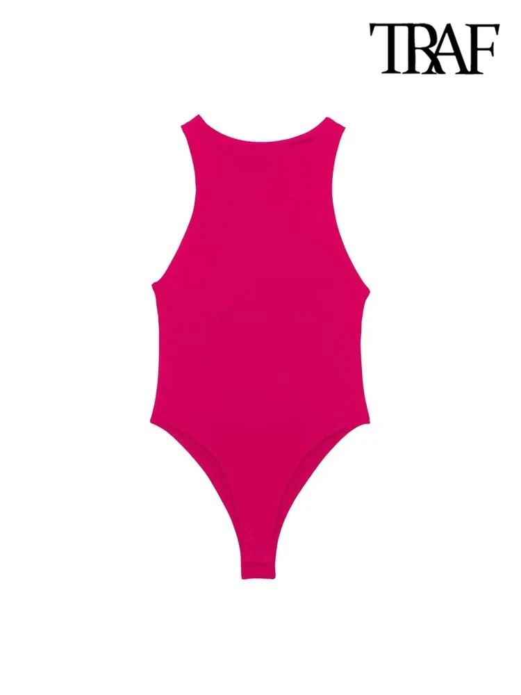 TRAF Women Fashion With Halter Neck Skinny Bodysuit Sexy Sleeveless Snap-button Female Playsuits Mujer