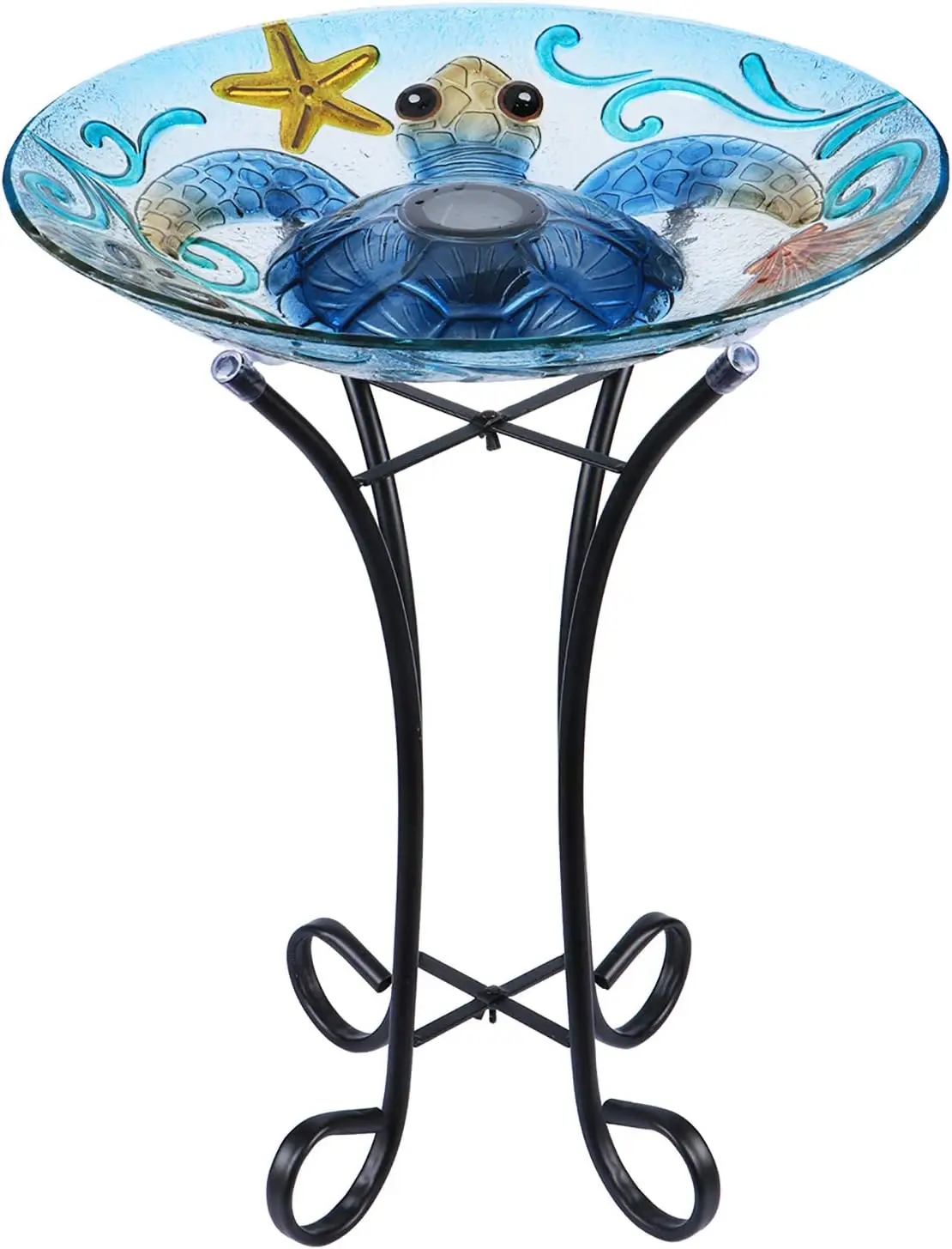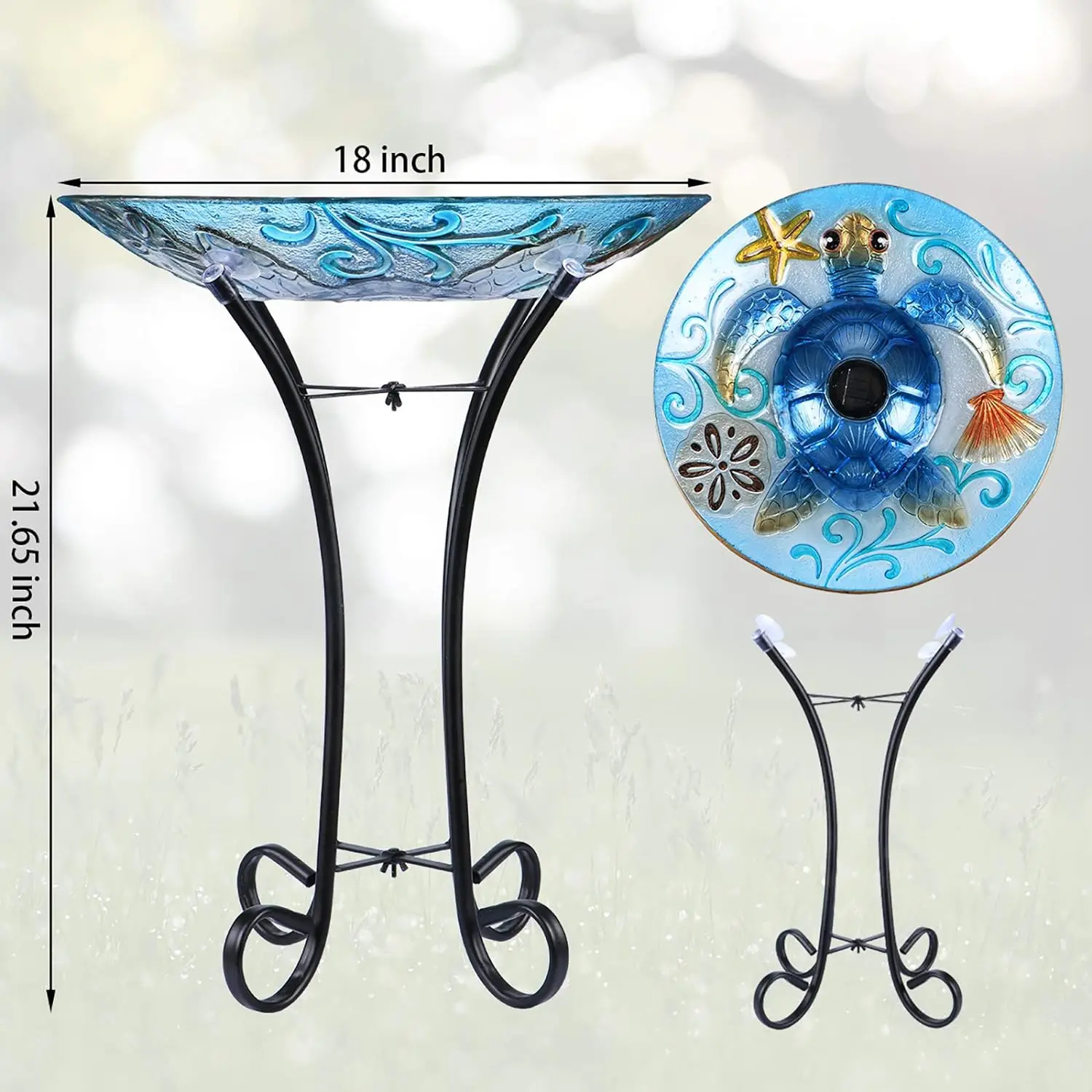 - Sea Turtle Bird Bath: Painted with special hot glass craft, this bird bath has vivid sea turtle pattern and bright blue color which would attract more birds to bathe. Solar power is the icing on the cake, will light up beautiful light at night