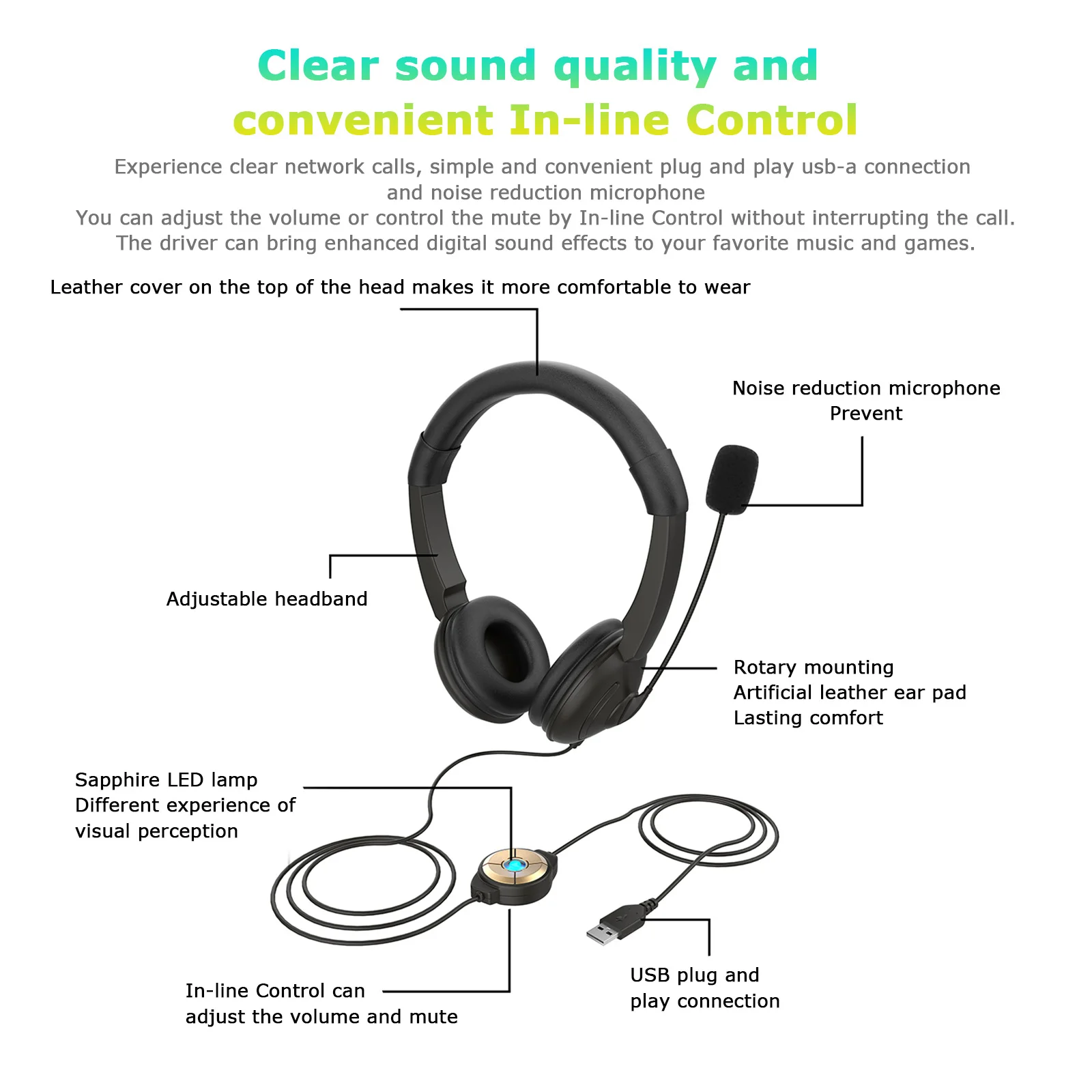 USB Wired Headset with Noise Cancelling Microphone On Ear Computer Headphone Call Center Volume Control Speaker Mic Headband